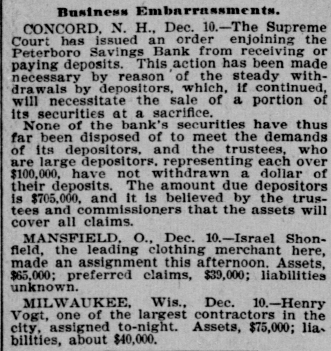 Business Embarrassments. CONCORD, N. H., Dec. 10.-The Supreme Court has issued an order enjoining the Peterboro Savings Bank from receiving or paying deposits. This action has been made necessary by reason of the steady withdrawals by depositors, which, if continued, will necessitate the sale of a portion of its securities at a sacrifice. None of the bank's securities have thus far been disposed of to meet the demands of its depositors, and the trustees, who are large depositors. representing each over $100,000, have not withdrawn a dollar of their deposits. The amount due depositors is $705,000, and it is believed by the trustees and commissioners that the assets will cover all claims. MANSFIELD, O., Dec. 10.-Israel Shonfield, the leading clothing merchant here, made an assignment this afternoon. Assets, $65,000; preferred claims, $39,000; liabilities unknown. MILWAUKEE, Wis., Dec. 10.-Henry Vogt, one of the largest contractors in the city, assigned to-night. Assets, $75,000; lia. bilities, about $40,000.