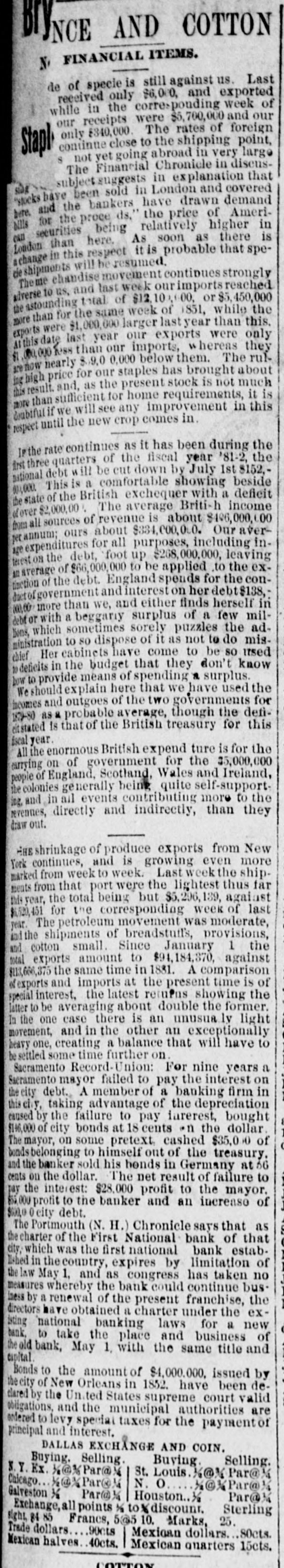 COTTON AND NCE N. FINANCIAL ITEMS. de of specie is still against us. Last received only $6,000, and exported the corre-ponding week were The rates close to the abroad very Stapl while our S continue only not receipts $340,000. in yet going $5,700,000 shipping in of in and discus- foreign point, large our of The Financial Chronicle subject suggests in explanation that been sold in London and covered the bankers have here. ds. the price Dills being in "stocks have securities and for the proce relatively drawn of higher demand American here. As soon as in this respect it is a change London than resumed. probable there that spe- is will he chandise movement Theme shipments continues imports strongly reached and last week our adverse total of $12,10 or the for the same week of essounding than to us. 851, while than $5, 6,450,000 this. the more $1,000,000 larger year last year our Althis date exports were imports, exports last whereas were they only $.9.00.000 are now for our staples as the present ing high nearly price and, below has stock them. brought is not The about much rulfor home we will any coubtful more this result. than if sufficient improvement requirements, in in it this is respect until the new crop comes rate continues as it has been during the of the year will be cut down first three Ip the debt quarters fiscal by July '81-2, 1st beside $152,- the is a comfortable of the British exchequer a 00,000. national the state This showing Briti-h with income deficit The average sources of revenue is ours about per annum of over $2,000.00 for mall $334.000,000. about including $406,000.000 Our aver- inage for all purposes, foot up terest on expenditures the debt, be $268,000,000, applied to leaving the of $66,000,000 to exthe debt. and than we, and in maverage duct of tinction 000,00 government more of England intereston either spends finds her for debt$138, herself the condebtor with a beggariy surplus of a few millions, which sometimes sorely puzzles the administration to so dispose of it as not to do mischief Her cabinets have come to be so used in the budget that they don't know how means of a here we the to deficits We should to provide explain spending that governments have surplus. used of the two for a average, defiincomes 1879-80 as and probable outgoes British treasury though the for this eit stated is that of the fiscal year All the enormous British expend ture is for the carrying on of government for the 35,000,000 people of England, Scotland, Wales and Ireland, e colonies generally being quite self-supporting, and in all events contributing more to the revenues, directly and indirectly, than they draw out. Hashrinkage of produce exports from New York and is growing even more marked week to week. continues, from Last week the thus shipments from that port were the lightest far this year, the total being but $5,296,139, agaiast $6,520,451 for the corresponding week of last year. The petroleum movement was moderate, and the shipments of breadstuff's, provisions, and cotton small. Since January 1 the total exports amount to $94,184,370, against $113,666,375 the same time in 1881. A comparison efexports and imports at the present time is of special interest, the latest returns showing the latter to be averaging about double the former. In the one case there is an unusua ly light movement, and in the other an exceptionally heavy one, creating a balance that will have to be settled some time further on Sacramento Record-Union: For nine years a Sacramento mayor failed to pay the interest on the city debt. A member of a banking firm in this eity, taking advantage of the depreciation caused by the failure to pay iarerest, bought $146,000 of city bonds at 18 cents on the dollar The mayor, on some pretext cashed $35,000 of bonds belonging to himself out of the treasury. and the banker sold his bonds in Germany at 66 cents on the dollar. The net result of failure to pay the interest: $28,000 profit to the mayor. 855.000 profit to the banker and an increase of $00,00city debt. The Portmouth (N. H.) Chronicle says that as the charter of the First National bank of that city, which was the first national bank established in the country, expires by limitation of the law May 1, and as congress has taken no measures whereby the bank could continue bus iness by a renewal of the present franchise, the directors have obtained a charter under the exlisting national banking laws for a new bank. to take the place and business of he old bank, May 1, with the same title and capital Bonds to the amount of $4,000.000, issued by the city of New Orleans in 1852. have been declared by the Un. ted States supreme court valid obligations, and the municipal authorities are ordered to levy special taxes for the paymentof principal and interest. DALLAS EXCHANGE AND COIN. Buying. Selling Buying Selling. Ex. % Par@ Y St. Louis. Par@Y N. o Calcago.. 1@XPar@M y@% (Par@)/4 Galveston 1/6 Par@ Y/ Houston. 1/a Par@Y Exchange, all points to (discount. Sterling sight @4 85 Francs, 5@5 10. Marks, 25. Trade dollars 90cts Mexican dollars. 80cts. Mexican halves 40cts. Mexican quarters 15cts.