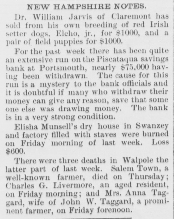 NEW HAMPSHIRE NOTES. Dr. William Jarvis of Claremont has sold from his own breeding of red Irish setter dogs, Elcho, jr., for $1000, and a pair of field puppies for $1000. For the past week there has been quite an extensive run on the Piscataqua savings bank at Portsmouth, nearly $75,000 having been withdrawn. The cause for this run is a mystery to the bank officials and it is doubtful if many who withdraw their money can give any reason, save that some one else was drawing money. The bank is in a very strong condition. Elisha Munsell's dry house in Swanzey and factory filled with staves were burned on Friday morning of last week. Loss $600. There were three deaths in Walpole the latter part of last week. Salem Town, a well-known farmer, died on Thursday; Charles G. Livermore, an aged resident, on Friday morning; and Mrs. Anna Taggard, wife of John W. Taggard, a prominent farmer, on Friday forenoon.