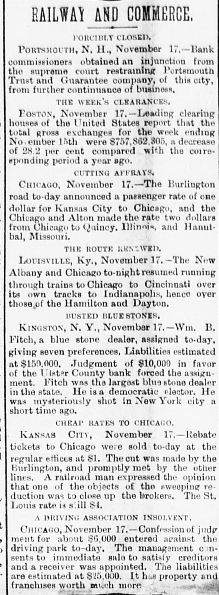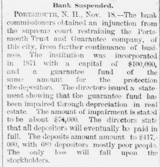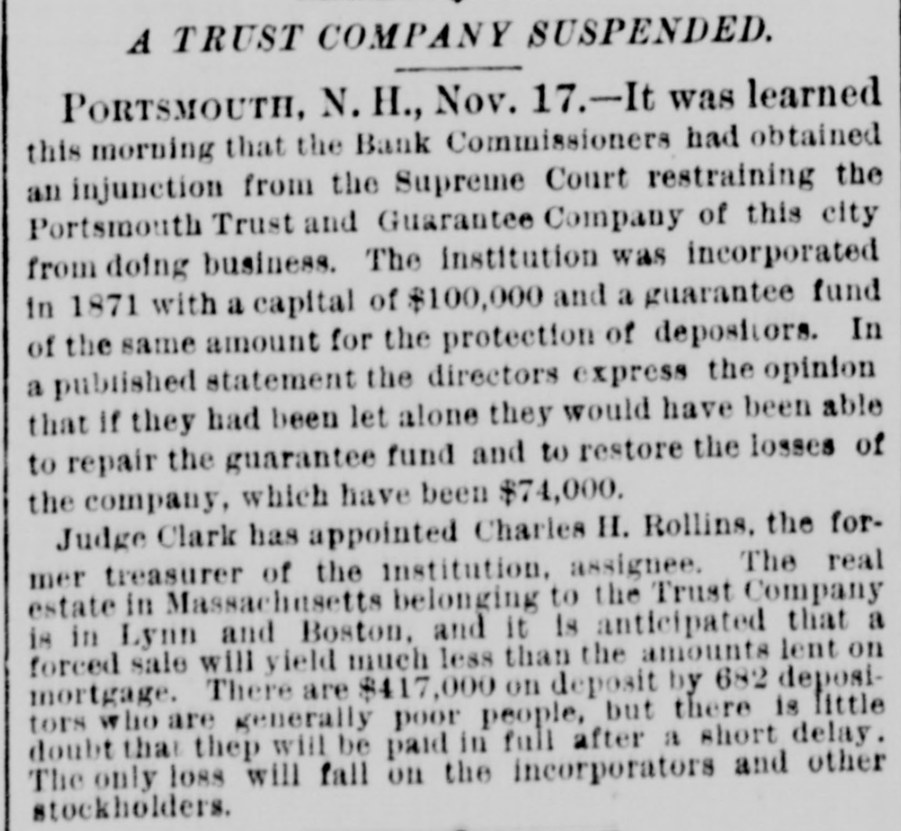 A TRUST COMPANY SUSPENDED. PORTSMOUTH, N. H., Nov. 17.-It was learned this morning that the Bank Commissioners had obtained an injunction from the Supreme Court restraining the Portsmouth Trust and Guarantee Company of this city from doing business. The institution was incorporated in 1871 with a capital of $100,000 and a guarantee fund of the same amount for the protection of depositors. In a published statement the directors express the opinion that If they had been let alone they would have been able to repair the guarantee fund and to restore the losses of the company, which have been $74,000. Judge Clark has appointed Charles H. Rollins, the former treasurer of the institution. assignee. The real estate in Massachusetts belonging to the Trust Company is in Lynn and Boston, and it is anticipated that a forced sale will yield much less than the amounts lent on mortgage. There are $417,000 on deposit by 682 depositors who are generally poor people, but there is little doubt that thep will be paid in full after a short delay. The only loss will fall on the incorporators and other stockholders.