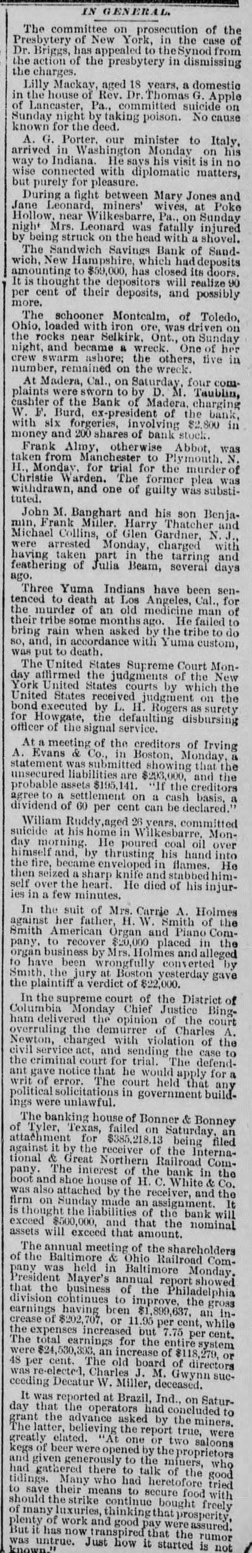 NJ The committee on prosecution of the Presbytery of New York, in the case of Dr. Briggs, has appealed to theSynod from the action of the presbytery in dismissing the charges. Lilly Mackay, aged 18 years, a domestic in the house of Rev. Dr. Thomas G. Apple of Lancaster, Pa., committed suicide on Sunday night by taking poison. No cause known for the deed. A. G. Porter, our minister to Italy. arrived in Washington Monday on his way to Indiana. He says his visit is in no wise connected with diplomatic matters, but purely for pleasure. During a fight between Mary Jones and Jane Leonard, miners' wives, at Poke Hollow, near Wilkesbarre, Pa., on Sunday night Mrs. Leonard was fatally injured by being struck on the head with a shovel. The Sandwich Savings Bank of Sandwich, New Hampshire, which had deposits amounting to $59,000, has closed its doors. It is thought the depositors will realize 90 per cent of their deposits, and possibly more. The schooner Montcalm, of Toledo, Ohio, loaded with iron ore, was driven on the rocks near Selkirk, Ont., on Sunday night, and became a wreck. One of her crew swarm ashore: the others, five in number, remained on the wreck. At Madera, Cal., on Saturday, four comIV "CI 4q 01 SMOTE area plaints cashier of the Bank of Madera. charging W. F. Burd, ex-president of the bank, with six forgeries, involving $2,800 in money and 200 shares of bank stock. Frank Almy, otherwise Abbot, was taken from Manchester to Plymouth, N. H., Monday, for trial for the murder of Christie Warden. The former plea was tuted. withdrawn, and one of guilty was substiJohn M. Banghart and his son Benjamin, Frank Miller. Harry Thatcher and Michael Collins, of Glen Gardner, N.J., were arrested Monday, charged with having taken part in the tarring and feathering of Julia Beam, several days 'owe Three Yuma Indians have been sentenced to death at Los Angeles, Cal., for the murder of an old medicine man of their tribe some months ago. He failed to bring rain when asked by the tribe to do vun чзем accordance up 'pur 'os death. 04 and SUM The United States Supreme Court Monday affirmed the judgments of the New York United States courts by which the United States received judgment on the bond executed by L. H. Rogers as surety for Howgate, the defaulting disbursing officer of the signal service. At a meeting of the creditors of Irving B Boston up "oo pg READS 'V statement was submitted showing that the unsecured liabilities are $293,000, and the probable assets $195,141. "If the creditors B basis, cash " uo stttement U 01 earee dividend of 60 per cent can be declared.' Wiliam Ruddy aged 26 years. committed suicide at his home in Wilkesbarre, Monday morning. He poured coal oil over himself and, by thrusting his hand into the fire, became enveloped in flames. He then seized a sharp knife and stabbed himself over the heart. He died of his injuries in a few minutes. In the suit of Mrs. Carrie A. Holmes against her father, H. W. Smith of the Smith American Organ and Piano Company, to recover $20,000 placed in the organ business by Mrs. Holmes and alleged to have been wrongfully converted by Smith, the jury at Boston yesterday gave the plaintiff a verdict of $22,000. In the supreme court of the District of Columbia Monday Chief Justice Bingham delivered the opinion of the court overruling the demurrer of Charles A. Newton, charged with violation of the civil service act, and sending the case to the criminal court for trial. The defendant gave notice that he would apply for a writ of error. The court held that any political solicitations in government buildings were unlawful. The banking house of Bonner & Bonney of Tyler, Texas, failed on Saturday, an attachment for $385,218.13 being filed against it by the receiver of the International & Great Northern Railroad Company. The interest of the bank in the boot and shoe house of H. C. White & Co. was also attached by the receiver, and the 71 uu эриш Arpung uo шлу is thought the liabilities of the bank will exceed $500,000, and that the nominal assets will exceed that amount. The annual meeting of the shareholders of the Baltimore & Ohio Railroad Company was held in Baltimore Monday, President Mayer's annual report showed that the business of the Philadelphia division cohtinues to improve, the gross earnings having been $1,899,637, an increase of $202,707, or 11.95 per cent, while the expenses increased but 7.75 per cent. The total earnings for the entire system were $24,530,393. an increase of $118,279, or 48 per cent. The old board of directors -ons GRAIN "W "f Charles SUM ceeding Decatur W. Miller, deceased. It was reported at Brazil, Ind., on Saturday that the operators had concluded to grant the advance asked by the miners. The latter, believing the report true, were seloons OM7 JO euo IV,, elated kegs of beer were opened by the