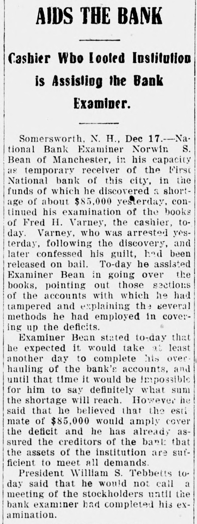 AIDS THE BANK Cashier Who Iooled Institution is Assisting the Bank Examiner. Somersworth, N. H., Dec 17.--National Bank Examiner Norwin S. Bean of Manchester, in his capacity as temporary receiver of the First National bank of this city, in the funds of which he discovered a shortage of about $85,000 yesterday, continued his examination of the books of Fred H. Varney, the cashier, today. Varney, who was arrested yesterday, following the discovery, and later confessed his guilt, had been released on bail. To-day he assisted Examiner Bean in going over the books, pointing out those sections of the accounts with which he had tampered and explaining the several methods he had employed in covering up the deficits. Examiner Bean stated to-day that he expected it would take at least another day to complete his overhauling of the bank's accounts, and until that time it would be Impossible for him to say definitely what sun the shortage will reach. However he said that he believed that the esti mate of $85,000 would amply cover the deficit and he has already assured the creditors of the bank that the assets of the institution are suificient to meet all demands. President William S. Tebbetts toa day said that he would not call meeting of the stockholders until the bank examiner bad completed his examination.