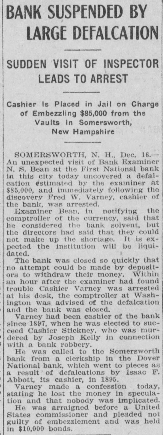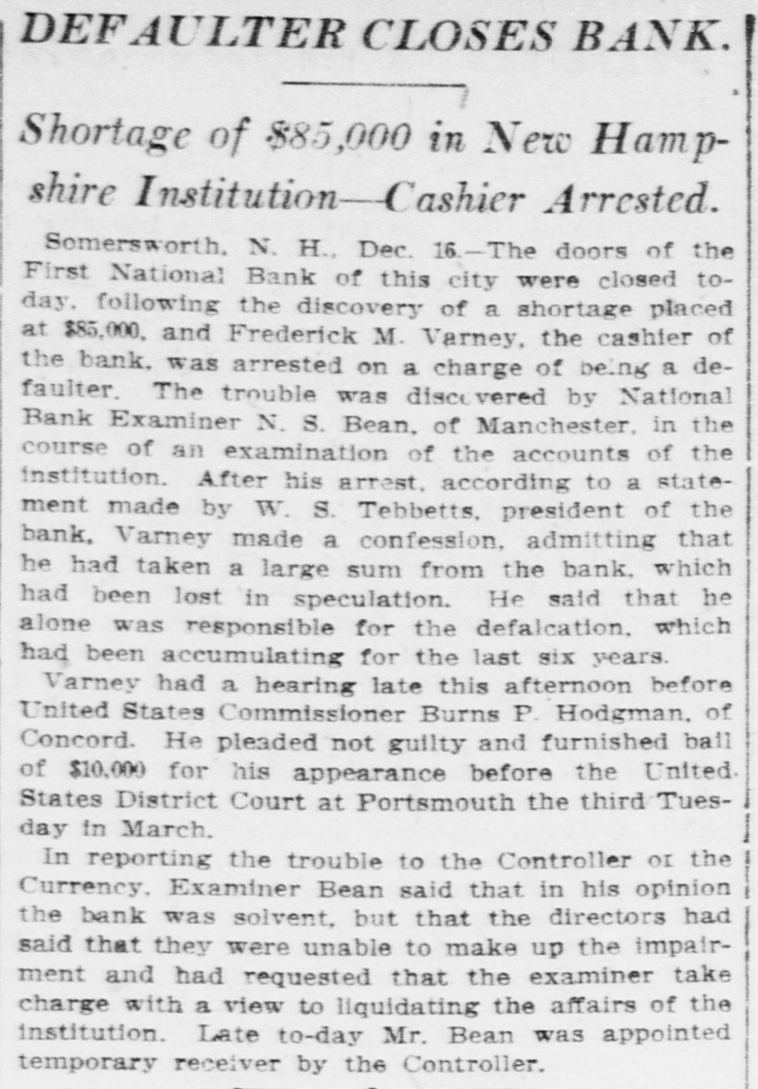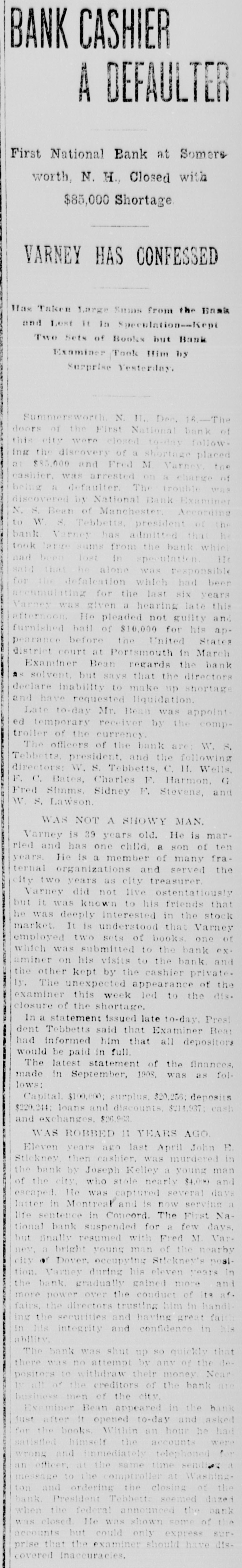 BANK SUSPENDED BY LARGE DEFALCATION SUDDEN VISIT OF INSPECTOR LEADS TO ARREST Cashier Is Placed in Jail on Charge of Embezzling $85,000 from the Vaults in Somersworth, New Hampshire SOMERSWORTH, N. H., Dec. 16.An unexpected visit of Bank Examiner N. S. Bean at the First National bank in this city today uncovered a defalcation estimated by the examiner at $85,000, and immediately following the discovery Fred W. Varney, cashier of the bank, was arrested. Examiner Bean, in notifying the comptroller of the currency, said that he considered the bank solvent, but the directors had said that they could not make up the shortage. It is expected the institution will be liquidated. The bank was closed so quickly that no attempt could be made by depositors to withdraw their money. Within an hour after the examiner had found trouble Cashier Varney was arrested at his desk, the comptroller at Washington was advised of the defalcation and the bank was closed. Varney had been cashier of the bank since 1897, when he was elected to succeed Cashier Stickney, who was murdered by Joseph Kelly in connection with a bank robbery. He was called to the Somersworth bank from a clerkship in the Dover National bank, which went to pieces as a result of defalcations by Isaac F. Abbott, its cashier, in 1895. Varney made a confession today, stating he lost the money in speculation and that nobody was implicated. He was arraigned before a United States commissioner and pleaded not guilty of embezzlement and was held in $10,000 bonds.