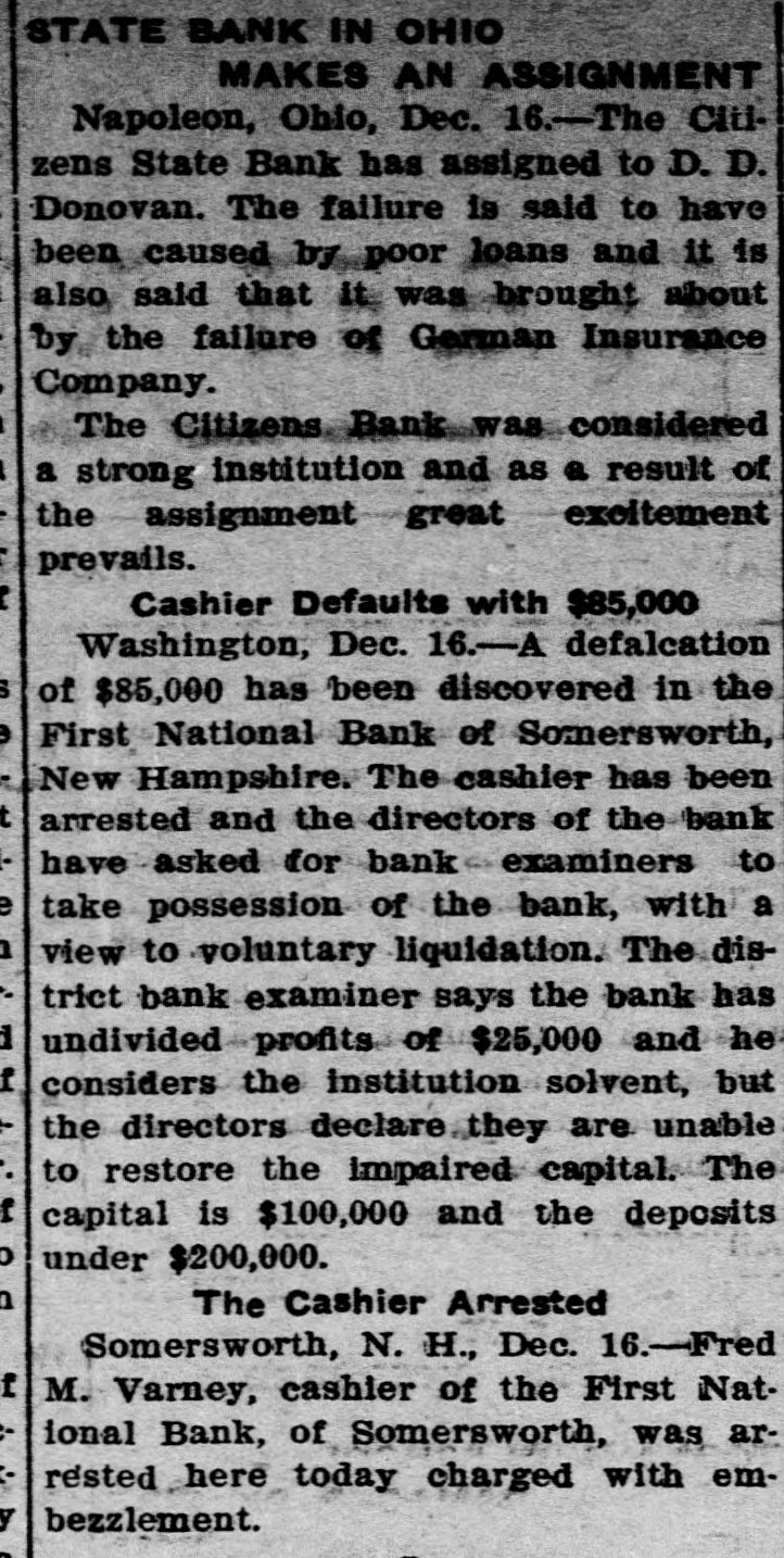 STATE BANK IN OHIO MAKES AN ASSIGNMENT Napoleon, Ohio, Dec. 16.-The Citizens State Bank has assigned to D. D. Donovan. The failure is said to have been caused by poor loans and it is also said that it was brought about by the failure of German Insurance Company. The Citizens Bank was considered a strong institution and as a result of the assignment great excitement prevails. Cashier Defaults with $85,000 Washington, Dec. 16.-A defalcation of $85,000 has been discovered in the First National Bank of Somersworth, New Hampshire. The cashier has been arrested and the directors of the bank have asked for bank examiners to take possession of the bank, with a view to voluntary liquidation. The district bank examiner says the bank has 1 undivided profits of $25,000 and he considers the institution solvent, but the directors declare they are unable to restore the impaired capital. The capital is $100,000 and the deposits under $200,000. The Cashier Arrested Somersworth, N. H., Dec. 16.-Fred f M. Varney, cashier of the First National Bank, of Somersworth, was arrested here today charged with embezzlement.