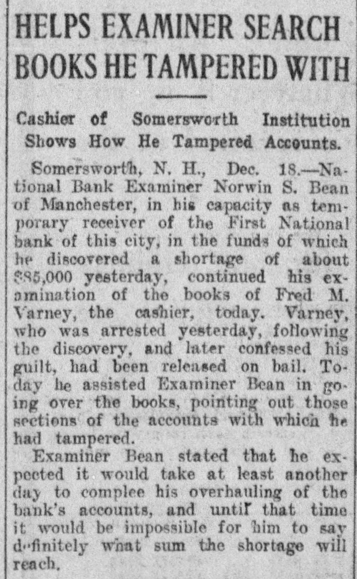 HELPS EXAMINER SEARCH BOOKS HE TAMPERED WITH Cashier of Somersworth Institution Shows How He Tampered Accounts. Somersworth, N. H., Dec. 18.-National Bank Examiner Norwin S. Bean of Manchester, in his capacity as temporary receiver of the First National bank of this city, in the funds of which he discovered a shortage of about $85,000 yesterday, continued his examination of the books of Fred M. Varney, the cashier, today. Varney, who was arrested yesterday, following the discovery, and later confessed his guilt, had been released on bail. Today he assisted Examiner Bean in going over the books, pointing out those sections of the accounts with which he had tampered. Examiner Bean stated that he expected it would take at least another day to complee his overhauling of the bank's accounts, and until that time it would be impossible for him to say definitely what sum the shortage will reach,