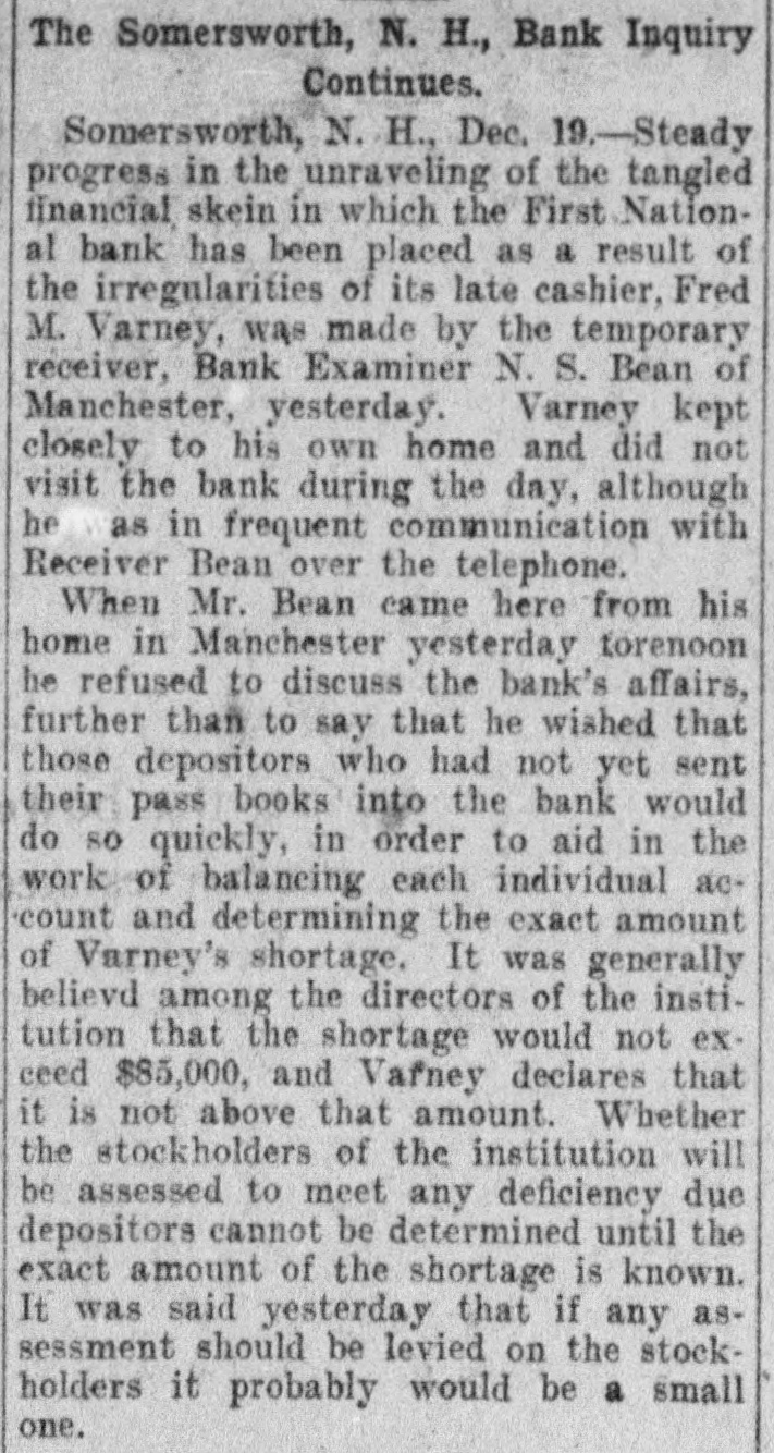 The Somersworth, N. H., Bank Inquiry Continues. Somersworth, N. H., Dec. 19.-Steady progress in the unraveling of the tangled financial skein in which the First National bank has been placed as a result of the irregularities of its late cashier, Fred M. Varney, was made by the temporary receiver, Bank Examiner N. S. Bean of Manchester, yesterday. Varney kept closely to his own home and did not visit the bank during the day, although he as in frequent communication with Receiver Bean over the telephone. When Mr. Bean came here from his home in Manchester yesterday torenoon he refused to discuss the bank's affairs, further than to say that he wished that those depositors who had not yet sent their pass books into the bank would do so quickly, in order to aid in the work of balancing each individual account and determining the exact amount of Varney's shortage. It was generally believd among the directors of the institution that the shortage would not exceed $85,000, and Varney declares that it is not above that amount. Whether the stockholders of the institution will be assessed to meet any deficiency due depositors cannot be determined until the exact amount of the shortage is known. It was said yesterday that if any assessment should be levied on the stockholders it probably would be a small one.