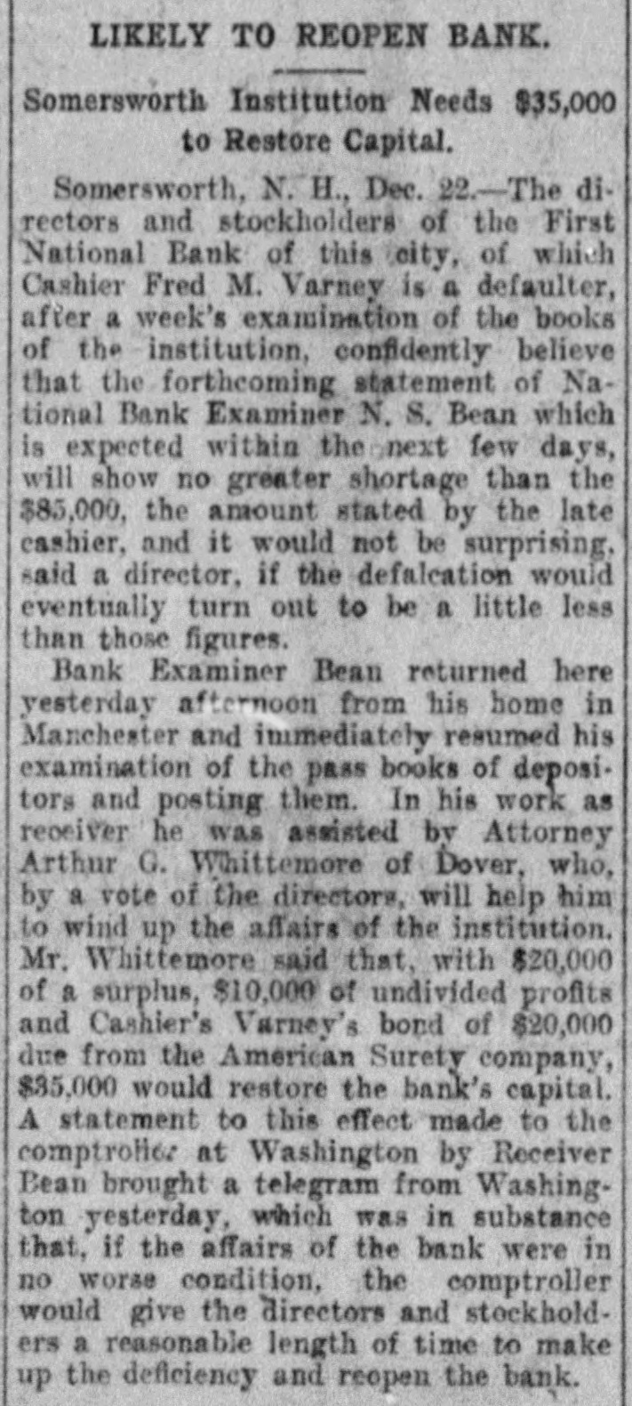 LIKELY TO REOPEN BANK. Somersworth Institution Needs $35,000 to Restore Capital. Somersworth, N. H., Dec. 22.-The directors and stockholders of the First National Bank of this city, of which Cashier Fred M. Varney is n defaulter, after a week's examination of the books of the institution, confidently believe that the forthcoming statement of National Bank Examiner N. S. Bean which is expected within the next few days, will show no greater shortage than the $85,000, the amount stated by the late cashier, and it would not be surprising. said a director, if the defalcation would eventually turn out to be a little less than those figures. Bank Examiner Bean returned here yesterday afternoon from his home in Manchester and immediately resumed his examination of the pass books of depositors and posting them. In his work as receiver he was assisted by Attorney Arthur G. Whittemore of Dover, who, by a vote of the directors, will help him to wind up the affairs of the institution. Mr. Whittemore said that, with $20,000 of a surplus, $10,000 of undivided profits and Cashier's Varney's bond of $20,000 due from the American Surety company, $85,000 would restore the bank's capital. A statement to this effect made to the comptroller at Washington by Receiver Bean brought a telegram from Washington yesterday, which was in substance that, if the affairs of the bank were in no worse condition, the comptroller would give the directors and stockholders a reasonable length of time to make up the deficiency and reopen the bank.