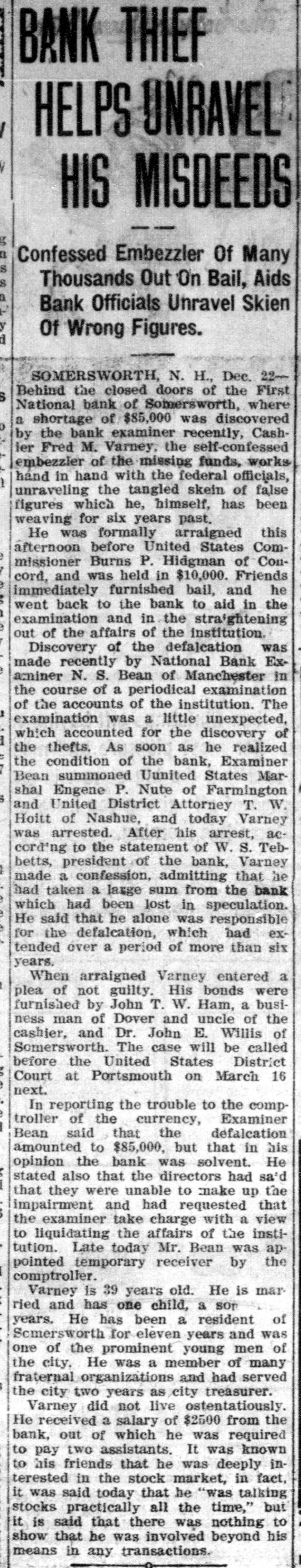 BANK THIEF HELPS UNRAVEL HIS MISDEEDS Confessed Embezzler Of Many Thousands Out On Bail, Aids Bank Officials Unravel Skien Of Wrong Figures. SOMERSWORTH, N. H., Dec. 22Behind the closed doors of the First National bank of Somersworth, where a shortage of $85,000 was discovered by the bank examiner recently, Cashler Fred M. Varney, the self-confessed embezzler of the missing funds, works hand in hand with the federal officials, unraveling the tangled skein of false figures which he, himself, has been weaving for six years past. He was formally arraigned this afternoon before United States Commissioner Burns P. Hidgman of Concord, and was held in $10,000. Friends immediately furnished bail, and he went back to the bank to aid in the examination and in the straightening out of the affairs of the institution. Discovery of the defalcation was made recently by National Bank Examiner N. S. Bean of Manchester in the course of a periodical examination of the accounts of the institution. The examination was a little unexpected, which accounted for the discovery of the thefts. As soon as he realized the condition of the bank, Examiner Bean summoned United States Marshal Engene P. Nute of Farmington and United District Attorney T. W. Hoitt of Nashue, and today Varney was arrested. After his arrest, according to the statement of W. S. Tebbetts, president of the bank, Varney made a confession, admitting that he had taken a large sum from the bank which had been lost in speculation. He said that he alone was responsible for the defalcation, which had extended over a period of more than six years. When arraigned Varney entered a plea of not guilty. His bonds were furnished by John T. W. Ham, a business man of Dover and uncle of the cashier, and Dr. John E. Willis of Somersworth. The case will be called before the United States District Court at Portsmouth on March 16 next. In reporting the trouble to the comptroller of the currency, Examiner Bean said that the defalcation amounted to $85,000, but that in his opinion the bank was solvent. He stated also that the directors had sa'd that they were unable to make up the impairment and had requested that the examiner take charge with a view to liquidating the affairs of the institution. Late today Mr. Bean was appointed temporary receiver by the comptroller. Varney is 39 years old. He is mar ried and has one child, a son years. He has been a resident of Scmersworth for eleven years and was one of the prominent young men of the city. He was a member of many fraternal organizations and had served the city two years as city treasurer. Varney did not live ostentatiously. He received a salary of $2500 from the bank, out of which he was required to pay two assistants. It was known to his friends that he was deeply interested in the stock market, in fact, it was said today that he "was talking stocks practically all the time," but it is said that there was nothing to show that he was involved beyond his means in any transactions.