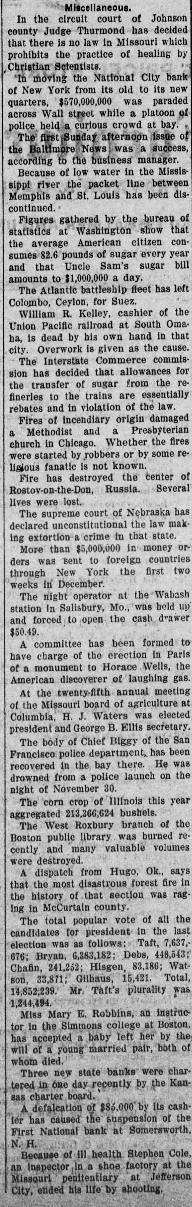 Miscellaneous. In the circuit court of Johnson county Judge Thurmond has decided that there is no law in Missouri which prohibits the practice of healing by Christian Scientists. In moving the National City bank of New York from its old to its new quarters, $570,000,000 was paraded across Wall street while a platoon of police held a curious crowd at bay The first Sunday afternoon issue of the Baltimore News was a success, according to the business manager. Because of low water in the Mississippi river the packet line between Memphis and St. Louis has been discontinued. Figures gathered by the bureau of statistics at Washington show that the average American citizen consumes 82.6 pounds of sugar every year and that Uncle Sam's sugar bill amounts to $1,000,000 a day. The Atlantic battleship fleet has left Colombo, Ceylon, for Suez. William R. Kelley, cashier of the Union Pacific railroad at South Omaha, is dead by his own hand in that city. Overwork is given as the cause. The Interstate Commerce commission has decided that allowances for the transfer of sugar from the refineries to the trains are essentially rebates and in violation of the law. Fires of incendiary origin damaged a Methodist and a Presbyterian church in Chicago. Whether the fires were started by robbers or by some religious fanatic is not known. Fire has destroyed the center of Rostov-on-the-Don, Russia. Several lives were lost. The supreme court of Nebraska has declared unconstitutional the law making extortion a crime in that state. More than $5,000,000 in money or ders was sent to foreign countries through New York the first two weeks in December. The night operator at the Wabash station in Salisbury, Mo., was held up and forced to open the cash drawer $50.49. A committee has been formed to have charge of the erection in Paris of a monument to Horace Wells, the American discoverer of laughing gas. At the twenty-fifth annual meeting of the Missouri board of agriculture at H. J. Waters was elected and George president Columbia, B. Ellis secretary The body of Chief Biggy of the San Francisco police department, has been recovered in the bay there. He was drowned from a police launch on the night of November 30. The corn crop of Illinois this year aggregated 213,366,624 bushels. The West Roxbury branch of the library was reand cently Boston public many valuable burned volumes were destroyed. A dispatch from Hugo, Ok., says that the most disastrous forest fire in the history of that section was rag ing in McCurtain county. The total popular vote of all the candidates for president in the last election was as follows: Taft, 7,637, 676; Bryan, 6,383,182; Debs, 448,543; Chafin, 241,252; Hisgen, 83,186; Watson, 33,871; Gilhaus, 15,421. Total, 14,852,239. Mr. Taft's plurality was 1.244.494. Miss Mary E. Robbins, an instructor in the Simmons college at Boston, has accepted a baby left her by the will of a young married pair, both of whom died. Three new state banks were chartered in one day recently by the Kansas charter board. A defalcation of $85,000 by its cashier has caused the suspension of the First National bank at Somersworth, N.H. Because of ill health Stephen Cole, an inspector in a shoe factory at the Missouri penitentiary at Jefferson City, ended his life by shooting.