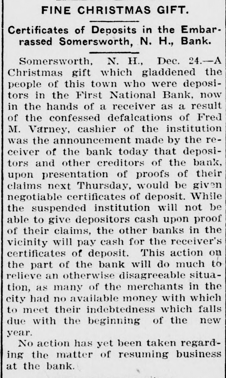 FINE CHRISTMAS GIFT. Certificates of Deposits in the Embarrassed Somersworth, N. H., Bank. Somersworth, N. H., Dec. 24.-A Christmas gift which gladdened the people of this town who were depositors in the First National Bank, now in the hands of a receiver as a result of the confessed defalcations of Fred M. Varney, cashier of the institution was the announcement made by the receiver of the bank today that depositors and other creditors of the bank, upon presentation of proofs of their claims next Thursday, would be given negotiable certificates of deposit. While the suspended institution will not be able to give depositors cash upon proof of their claims, the other banks in the vicinity will pay cash for the receiver's certificates of deposit. This action on the part of the bank will do much to relieve an otherwise disagreeable situation, as many of the merchants in the city had no available money with which to meet their indebtedness which falls due with the beginning of the new year. No action has yet been taken regarding the matter of resuming business at the bank.
