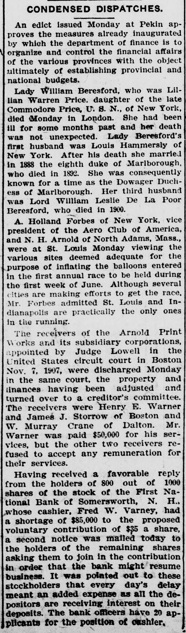 CONDENSED DISPATCHES. An edict issued Monday at Pekin approves the measures already inaugurated by which the department of finance is to organize and control the financial affairs of the various provinces with the object ultimately of establishing provincial and national budgets. Lady William Beresford, who was Lillian Warren Price. daughter of the late Commodore Price, U. S. N., of New York, died Monday in London. She had been ill for some months past and her death was not unexpected. Lady Beresford's first husband was Louis Hammersly of New York. After his death she married in 1888 the eighth duke of Marlborough, who died in 1892. She was consequently known for a time as the Dowager Duchess of Marlborough. Her third husband was Lord William Leslie De La Poor Beresford, who died in 1900. A. Holland Forbes of New York, vice president of the Aero Club of America, and N. H. Arnold of North Adams, Mass., were at St. Louis Monday viewing the various sites deemed adequate for the purpose of inflating the balloons entered in the first annual race to be held during the first week of June. Although several cities are making efforts to get the race, Mr. Forbes admitted St. Louis and Indianapolis are practically the only ones in the running. The receivers of the Arnold Print Works and its subsidiary corporations, appointed by Judge Lowell in the United States circuit court in Boston Nov. 7, 1907, were discharged Monday in the same court, the property and linances having been adjusted and turned over to a creditor's committee. The receivers were Henry E. Warner and James J. Storrow of Boston and W. Murray Crane of Dalton. Mr. Warner was paid $50,000 for his services, but the other two receivers refused to accept any remuneration for their services. Having received a favorable reply from the holders of 800 out of 1000 shares of the stock of the First National Bank of Somersworth, N. H.. whose cashier, Fred W. Varney, had a shortage of $85,000 to the proposed voluntary contribution of $35 a share, a second notice was mailed today to the holders of the remaining shares asking them to join in the contribution in order that the bank might resume business. It was pointed out to these stockholders that every day's delay meant an added expense as all the depositors are receiving interest on their deposits. The bank officers have 20 applicants for the position of cashier.