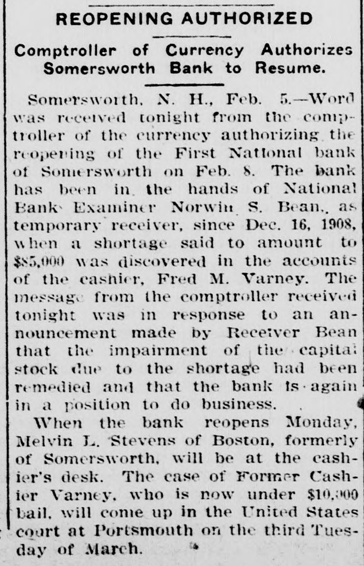 REOPENING AUTHORIZED Comptroller of Currency Authorizes Somersworth Bank to Resume. Somersworth. N. H., Feb. 5.-Word was received tonight from the comptroller of the currency authorizing the reopening of the First National bank of Somersworth on Feb. 8. The bank has been in. the hands of National Bank Examiner Norwin S. Bean., as temporary receiver, since Dec. 16, 1908, when a shortage said to amount to $85,000 was discovered in the accounts of the cashier, Fred M. Varney. The message from the comptroller received tonight was in response to an announcement made by Receiver Bean that the impairment of the capital stock due to the shortage had been remedied and that the bank is again in a position to do business. When the bank reopens Monday, Melvin L. Stevens of Boston, formerly of Somersworth. will be at the cashier's desk. The case of Former Cashier Varney, who is now under $10,000 bail. will come up in the United States court at Portsmouth on the third Tuesday of March.