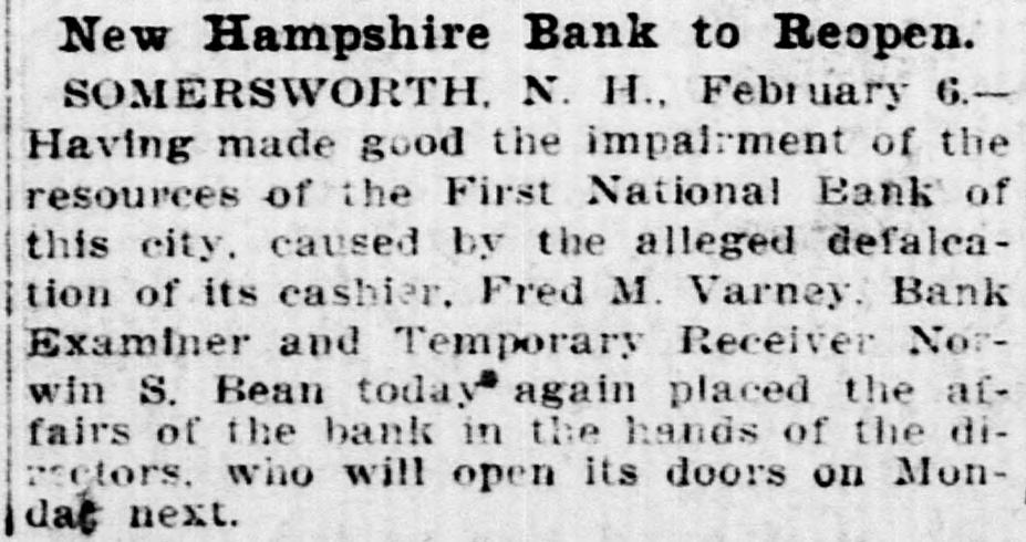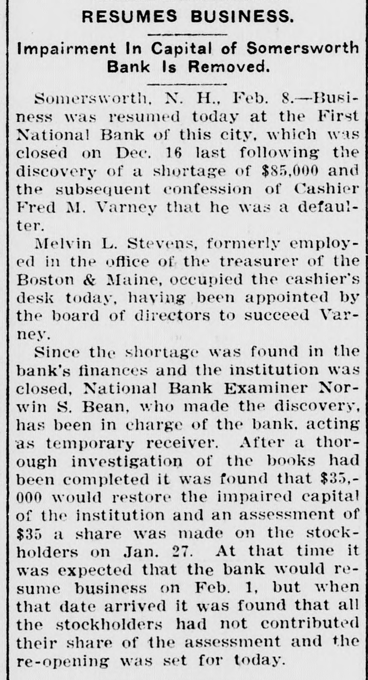 RESUMES BUSINESS. Impairment In Capital of Somersworth Bank Is Removed. Somersworth, N. H., Feb. 8.-Business was resumed today at the First National Bank of this city, which was closed on Dec. 16 last following the discovery of a shortage of $85,000 and the subsequent confession of Cashier Fred M. Varney that he was a defaulter. Melvin L. Stevens, formerly employed in the office of the treasurer of the Boston & Maine, occupied the cashier's desk today, having been appointed by the board of directors to succeed Varney. Since the shortage was found in the bank's finances and the institution was closed, National Bank Examiner Norwin S. Bean, who made the discovery, has been in charge of the bank. acting as temporary receiver. After a thorough investigation of the books had been completed it was found that $35,000 would restore the impaired capital of the institution and an assessment of $35 a share was made on the stockholders on Jan. 27. At that time it was expected that the bank would resume business on Feb. 1, but when that date arrived it was found that all the stockholders had not contributed their share of the assessment and the re-opening was set for today.