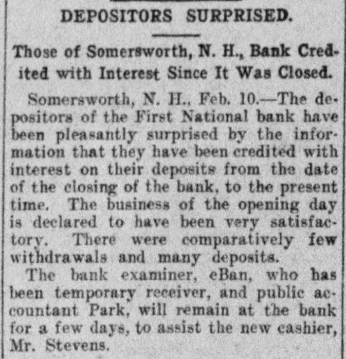 DEPOSITORS SURPRISED. Those of Somersworth, N. H., Bank Credited with Interest Since It Was Closed. Somersworth, N. H., Feb. 10.-The depositors of the First National bank have been pleasantly surprised by the information that they have been credited with interest on their deposits from the date of the closing of the bank, to the present time. The business of the opening day is declared to have been very satisfactory. There were comparatively few withdrawals and many deposits. The bank examiner, eBan, who has been temporary receiver, and public accountant Park, will remain at the bank for a few days, to assist the new cashier, Mr. Stevens.