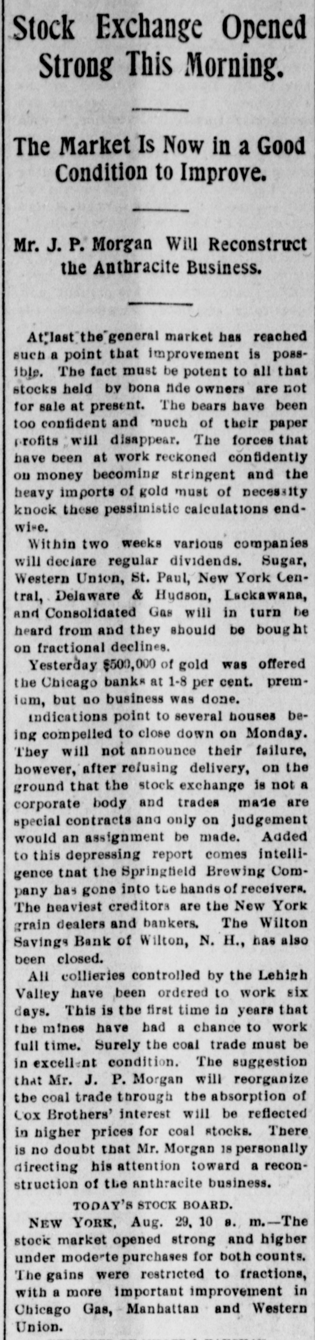 Stock Exchange Opened Strong This Morning. The Market Is Now in a Good Condition to Improve. Mr. J. P. Morgan Will Reconstruct the Anthracite Business. At"last the general market has reached such a point that improvement is possible. The fact must be potent to all that stocks held by bona fide owners are not for sale at present. The bears have been too confident and much of their paper profits will disappear. The forces that have been at work reckoned confidently on money becoming stringent and the heavy imports of gold must of necessity knock these pessimistic calculations endwise. Within two weeks various companies will declare regular dividends. Sugar, Western Union, St. Paul, New York Central, Delaware & Hydson, Lackawana, and Consolidated Gas will in turn be heard from and they should be bought on fractional declines. Yesterday $500,000 of gold was offered the Chicago banks at 1-8 per cent. premium, but no business was done. indications point to several houses being compelled to close down on Monday. They will not announce their failure, however, after refusing delivery, on the ground that the stock exchange is not a corporate body and trades made are special contracts and only on judgement would an assignment be made. Added to this depressing report comes intelligence that the Springfield Brewing Company has gone into the hands of receivers. The heaviest creditors are the New York grain dealers and bankers. The Wilton Savings Bank of Wilton, N. H., has also been closed. All collieries controlled by the Lehigh Valley have been ordered to work six days. This is the first time in years that the mines have had a chance to work full time. Surely the coal trade must be in excellent condition. The suggestion that Mr. J. P. Morgan will reorganize the coal trade through the absorption of Cox Brothers' interest will be reflected in higher prices for coal stocks. There is no doubt that Mr. Morgan 18 personally directing his attention toward a reconstruction of the anthracite business. TODAY'S STOCK BOARD. NEW YORK, Aug. 29, 10 8. m.-The stock market opened strong and higher under moderte purchases for both counts. The gains were restricted to fractions, with a more important improvement in Chicago Gas, Manhattan and Western Union.