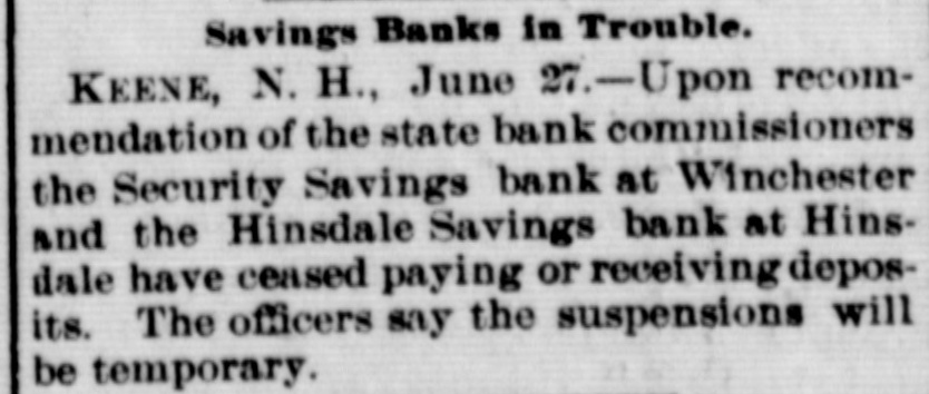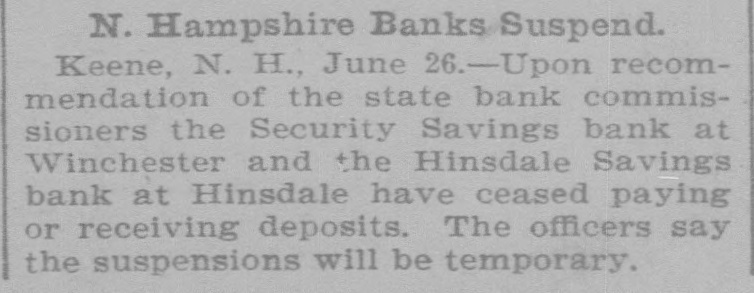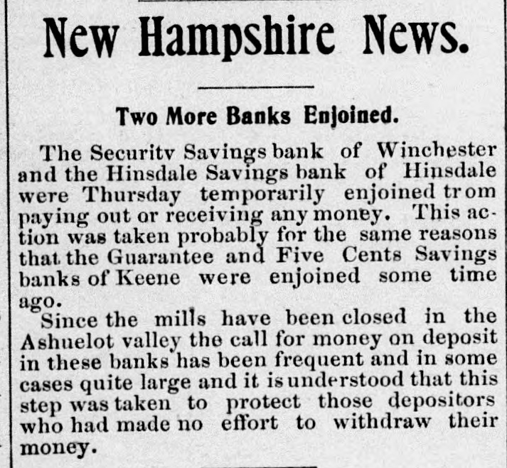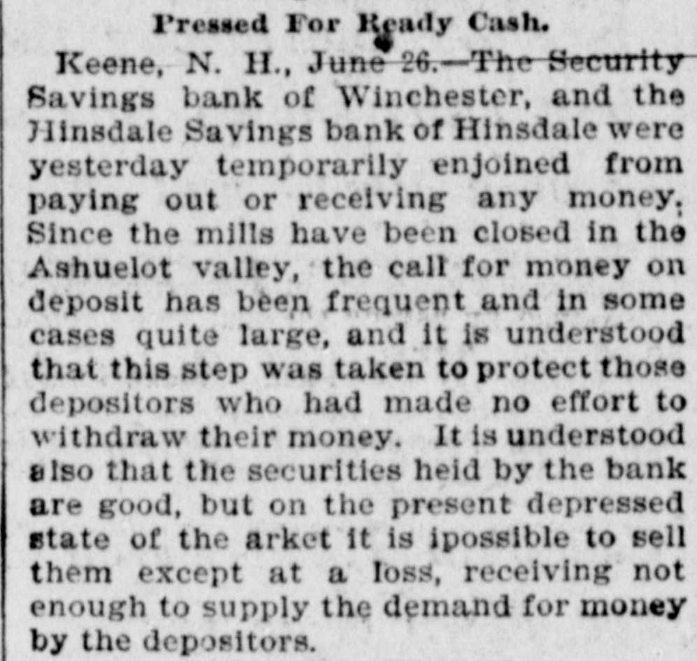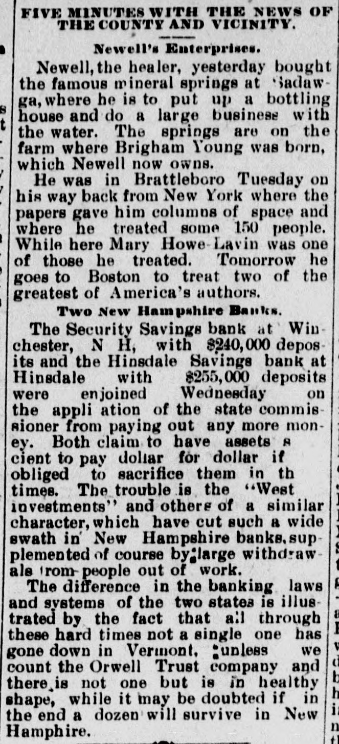 FIVE MINUTES WITH THE NEWS OF THE COUNTY AND VICINITY. Newell's Enterprises. Newell, the healer, yesterday bought the famous mineral springs at Sadawga, where he is to put up a bottling 8 house and do a large business with the water. The springs are on the farm where Brigham Young was born, which Newell now owns. He was in Brattleboro Tuesday on his way back from New York where the papers gave him columns of space and where he treated some 150 people. While here Mary Howe Lavin was one of those he treated. Tomorrow he goes to Boston to treat two of the greatest of America's authors. Two New Hampshire Banks. The Security Savings bank at Win chester, N H, with $240,000 deposits and the Hinsdale Savings bank at Hinsdale with $255,000 deposits were enjoined Wednesday on the appli ation of the state commissioner from paying out any more money. Both claim to have assets 8 cient to pay dollar for dollar if obliged to sacrifice them in th times. The trouble is the "West investments" and others of a similar character, which have cut such a wide swath in' New Hampshire banks. sup plemented of course bylarge withdraw als from- people out of work. The difference in the banking laws and systems of the two states is illustrated by the fact that all through these hard times not a single one has gone down in Vermont, :unless we count the Orwell Trust company and there is not one but is in healthy shape, while it may be doubted if in the end a dozen will survive in New Hamphire.