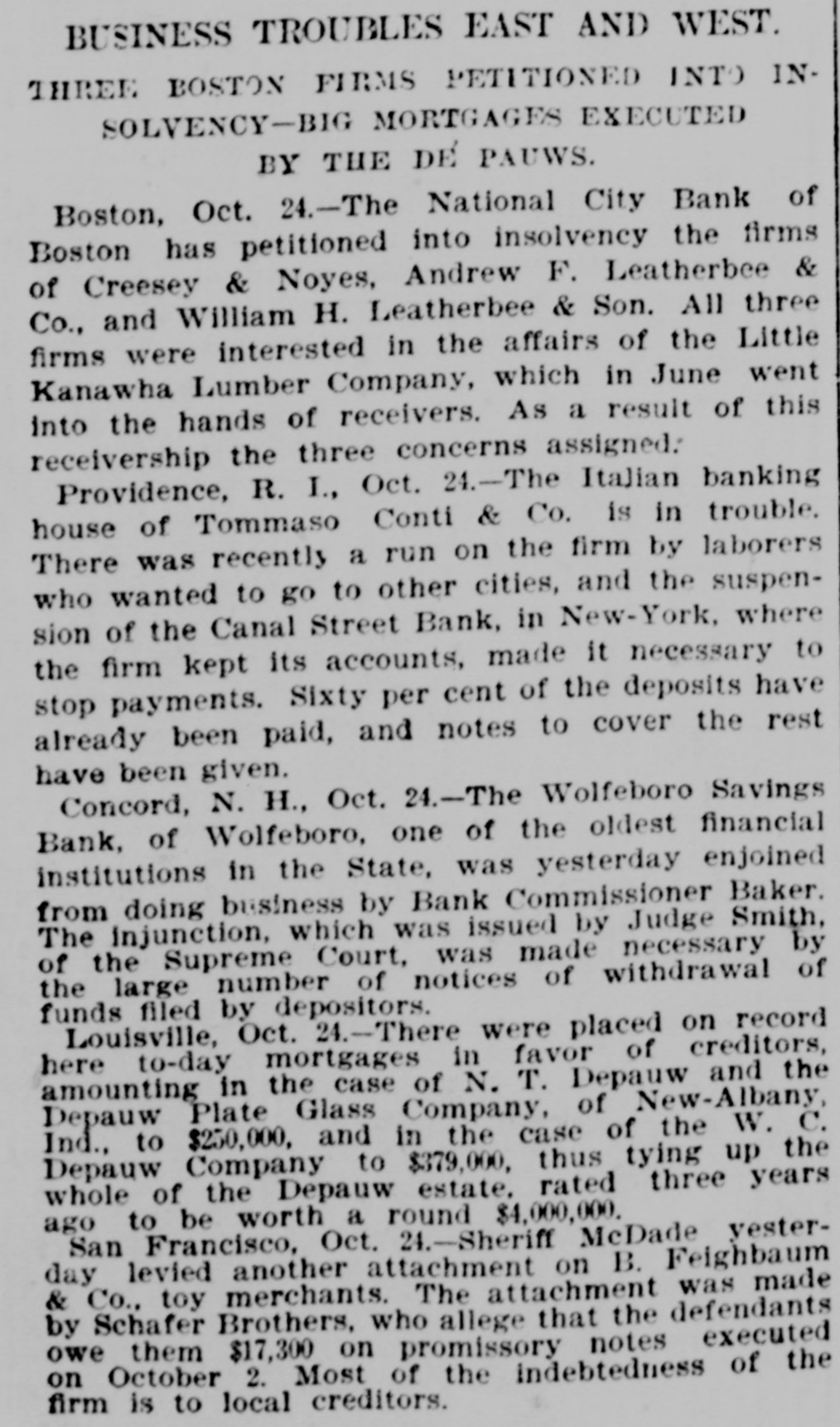 BUSINESS TROUBLES EAST AND WEST. THREE BOSTON FIRMS PETITIONED INTO INSOLVENCY-BIG MORTGAGES EXECUTED BY THE DE PAUWS. Boston, Oct. 24.-The National City Bank of Boston has petitioned into insolvency the firms of Creesey & Noyes, Andrew F. Leatherbee & Co., and William H. Leatherbee & Son. All three firms were interested in the affairs of the Little Kanawha Lumber Company, which in June went into the hands of receivers. As a result of this receivership the three concerns assigned: Providence, R. I., Oct. 24.-The Italian banking house of Tommaso Conti & Co. is in trouble. There was recently a run on the firm by laborers who wanted to go to other cities, and the suspension of the Canal Street Bank, in New-York, where the firm kept its accounts, made it necessary to stop payments. Sixty per cent of the deposits have already been paid, and notes to cover the rest have been given. Concord, N. H., Oct. 24.-The Wolfeboro Savings Bank, of Wolfeboro, one of the oldest financial institutions in the State, was yesterday enjoined from doing business by Bank Commissioner Baker. The injunction, which was issued by Judge Smith, of the Supreme Court, was made necessary by the large number of notices of withdrawal of funds filed by depositors. Louisville, Oct. 24.-There were placed on record here to-day mortgages in favor of creditors, amounting in the case of N. T. Depauw and the Depauw Plate Glass Company, of New-Albany, Ind., to $250,000, and in the case of the W. C. Depauw Company to $379,000, thus tying up the whole of the Depauw estate. rated three years ago to be worth a round $4,000,000. San Francisco, Oct. 24.-Sheriff McDade yesterday levied another attachment on B. Feighbaum & Co., toy merchants. The attachment was made by Schafer Brothers, who allege that the defendants owe them $17,300 on promissory notes executed on October 2. Most of the indebtedness of the firm is to local creditors.