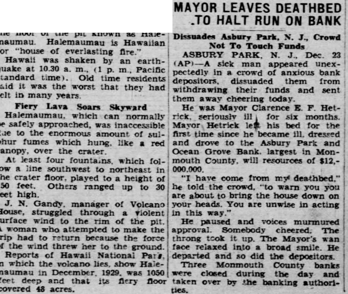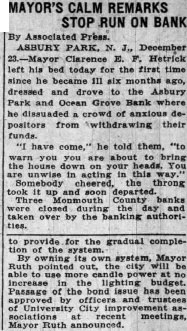ASBURY PARK. (AP) Mayor Clarence E. Hetrick, who has been seriously ill for the past six months, left his sick bed to stop run on the Asbury Park and Ocean Grove Bank, the largest bank in Monmouth County, with resources of It was the mayor's first public appearance Summer. The effect of his presence and his halted the suddenly had begun. was deposhundreds more talked excitedly for the mayor unexappeared. Men and women stood aside to let him inside. Standing the pass midst the crowd indoors mayor held up his hands for silence. Then he spoke. heard this," he said, "and have you that down are You are unwise in own this spoke further He told the people confidence in the judg. ment the men whom they had their money He paused and voices began murThen someone muring cheered Almost instantly others began cheering The mayor's wan face relaxed and he smiled and the crowd. taking heed his words, Banking hours went the doors of the building closed.