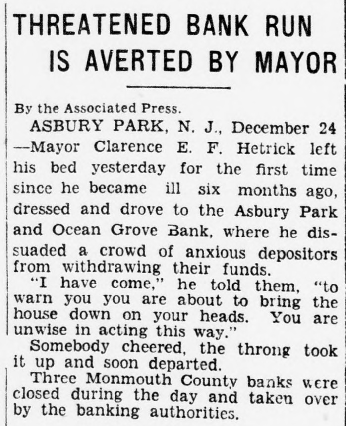 THREATENED BANK RUN IS AVERTED BY MAYOR By the Associated Press. ASBURY PARK, N. J., December 24 -Mayor Clarence E. F. Hetrick left his bed yesterday for the first time since he became ill six months ago, dressed and drove to the Asbury Park and Ocean Grove Bank, where he dissuaded a crowd of anxious depositors from withdrawing their funds. "I have come," he told them, "to warn you you are about to bring the house down on your heads. You are unwise in acting this way." Somebody cheered, the throng took it up and soon departed. Three Monmouth County banks were closed during the day and taken over by the banking authorities.