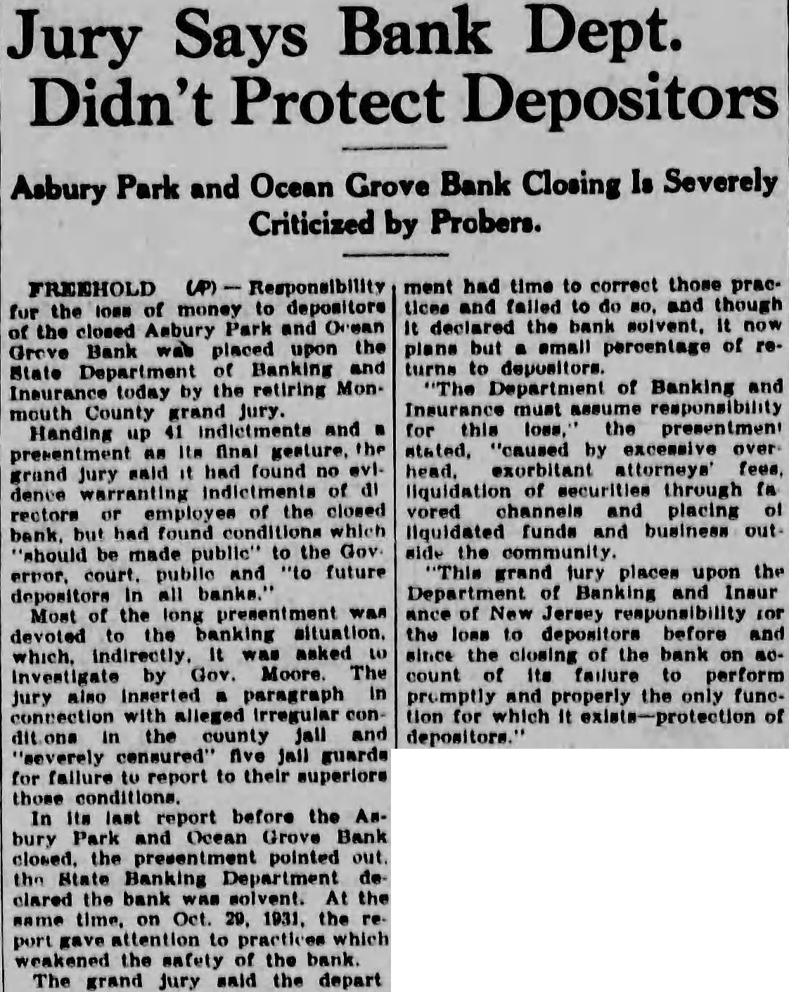 FREEHOLD (AP) Responsibility the of money depositors for of the closed Asbury Park and Orean Grove Bank placed upon the State Department Banking Insurance today the retiring Monmouth grand Jury. and Handing up its final the grand Jury said it had found no evidence of di employee of the closed rectors had found which but "should made public" to the Gov court. public and "to future depositors all banks. Most the long presentment was devoted banking situation. which, indirectly. asked Investigate Gov. Moore. The jury also inserted paragraph in connection with alleged concounty and "severely consured' five jail guards for failure report to their superiors In its last report before the Anbury Park and Ocean Grove Bank closed. the presentment pointed out. the State Banking Department clared the bank solvent. At the same time, Oct. 29. 1931. the gave which weakened the safety of the bank. The grand jury said the depart ment had time to correct those pracand falled to do so, and though It declared the bank solvent, plane but email percentage of returns to "The Department of Banking and must responsibility for this the presentment stated. "caused by excessive over attorneys' liquidation of securities through in vored channels placing liquidated funds and business out side the community. "This grand jury places upon the Department of Banking Insur ance of New Jersey responsibility for the loss to depositors before and since the closing of the bank on account its failure to perform promptly and properly the only funetion for which It of depositors.
