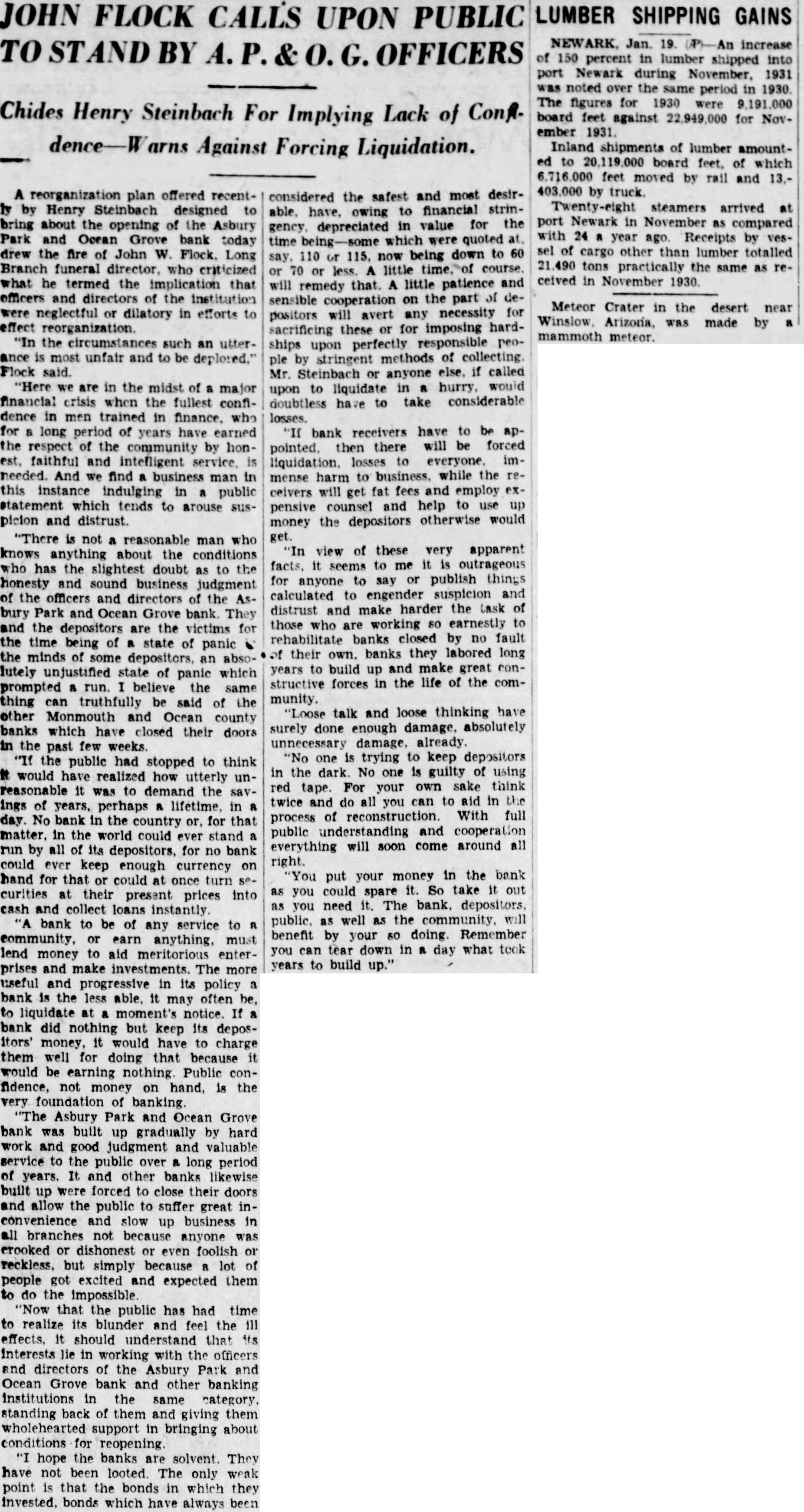 A reorganization plan offered recentby by Henry Steinbach designed to bring about the opening of the Asbury Park and Ocean Grove bank today drew the fire of John W. Flock. Long Branch funeral director, who criticized what he termed the implication that officers and directors of the institution were neglectful or dilatory in efforts to effect reorganization. "In the circumstances such an utterance is most unfair and to be deplored, Flock said. "Here we are in the midst of major financial crisis when the fullest confidence in men trained in finance. who for long period of years have earned the respect of the community by honest. faithful and intefligent service, is needed. And we find business man in this instance indulging in public statement which tends to arouse suspicion and distrust. "There not reasonable man who knows anything about the conditions who has the slightest doubt as the honesty and sound business judgment of the officers and directors of the Asbury Park and Ocean Grove bank They and the depositors are the victims for the time being of a state of panic the minds of some depositors, an absolutely unjustified state of panic which prompted run. believe the same thing can truthfully be said of the other Monmouth and Ocean county banks which have closed their doors in the past few weeks. "If the public had stopped to think It would have realized how utterly unreasonable it was to demand the savings of years, perhaps a lifetime. in day. No bank in the country or, for that matter. in the world could ever stand run by all of its depositors, for no bank could ever keep enough currency on hand for that or could at once securities at their present prices into cash and collect loans instantly "A bank to be of any service to R community. or earn anything. must lend money to aid meritorious enterprises and make investments. The more useful and progressive in its policy bank is the less able. it may often be, to liquidate at notice. If a bank did nothing but keep its depositors' money, it would have to charge them well for doing that because it would be earning nothing Public confidence, not money on hand, is the very foundation of banking "The Asbury Park and Ocean Grove bank was built up gradually by hard work and good judgment and valuable service the public over long period of years. It. and other banks likewise built up were forced to close their doors and allow the public to suffer great inconvenience and slow up business in all branches not because anyone was crooked or dishonest or even foolish or reckless. but simply because lot of people got excited and expected them to do the impossible "Now that the public has had time to realize its blunder and feel the ill effects. it should understand that its interests lie in working with the officers and directors of the Asbury Park and Ocean Grove bank and other banking institutions in the same category. standing back of them and giving them wholehearted support in bringing about conditions for reopening "I hope the banks are solvent They have not been looted. The only weak point that the bonds in which they invested. bonds which have always been considered the safest and most desirable. have, owing to financial stringency depreciated in value for the time which were quoted being down to 60 110 or now or 70 or less. little time. course. will remedy that. A little patience and sensible cooperation on the part of depositors will avert any necessity for sacrificing these or for imposing hardships upon perfectly responsible people by stringent methods of collecting. Mr. Steinbach or anyone else. if called upon to liquidate in hurry. would doubtless have to take considerable losses. "If bank receivers have to be appointed. then there will be forced liquidation. losses to everyone. immense harm to business. while the receivers will get fat fees and employ expensive counsel and help up money the depositors otherwise would get.