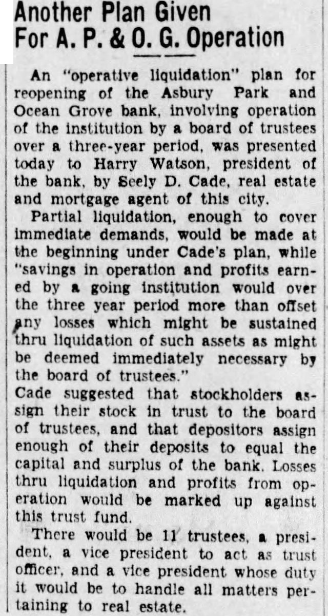 An "operative liquidation" plan for reopening of the Asbury Park and Ocean Grove bank. involving operation of the institution by board of trustees over three-year period. was presented today to Harry Watson, president of the bank. by Seely D. Cade, real estate and mortgage agent of this city. Partial liquidation, enough to cover immediate demands, would be made at the beginning under Cade's plan, while "savings in operation and profits earned by going institution would over the three year period more than offset any losses which might be sustained thru liquidation of such assets as might be deemed immediately necessary by the board of trustees." Cade suggested that stockholders assign their stock in trust to the board of trustees, and that depositors assign enough of their deposits to equal the capital and surplus of the bank. Losses thru liquidation and profits from operation would be marked up against this trust fund. There would be 11 trustees. president, vice president to act as trust officer, and vice president whose duty it would be to handle all matters pertaining to real estate.