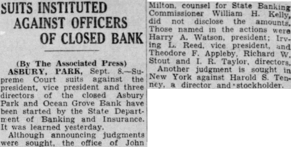 The matter of a compromise of tax liens on the George Crawford property was presented by Borough Attorney Howard W. Roberts The property was bid in at tax sale by Attorney Ezra W. Karkus for the benefit of the heirs to the estate Allen Poling represented the heirs at the meeting Monday night. The matter was referred to a committee consisting of Councilmen Camp. Smith and Van Pelt The financial statement of Collector Charles R. Davison showed that there was a balance of $8,896.71 in the general fund. $437.03 in the water account and $834.14 in the capital and trust account Bills to the aggregate sum of $7.977 45 were approved for payment. By resolution, an emergency appropriation of $284.20 was made for the care of the poor A water anticipation note for $1,300 was authorized. This note, given for three months. is payable at the Peoples National Bank An unexpended balance of the street appropriation of $843.62 the sum of $446.02 was transferred to the police appropriation and $397.60 to the sewer appropriation. accounts All excitement has entirely subsided. Many deposits were made to express confidence in the institution and a cial confidence was manifest in large private deposit made the first the Hon, Henry E. Ackerson, president of The Peoples National Bank when interviewed said, "We are deeply appreciative of the splendid confidence manifested at this time by the people of the community in the integrity and stability of the Borough's financial institutions The Matawan Bank is the eighth Lanking institution to close Monmouth County in less than week. The Seacoast Trust Company of Asbury Park was the first to close on Tuesday afternoon last week. The following day the Merchants Trust Company of Red Bank the New Jersey Trust Company and the Citizens National Bank both of Long Branch, were closed The fifth bank to suspend business was the Asbury Park and Ocean Grove Bank of Asbury Park and the following notice signed by George Compton a bank examiner was posted on the The of Banking and Insurance has taken of the business and property of the Asbury Park and Ocean Grove Bank The bank is state institution and is the largest in Monmouth County in the matter of resources which total more than $12,000,000 The combined resources of the other four banks according to the financial statements filed with the State Department of Banking and and Insurance on September 29 last amounted to $11,361,326 Bank depositors continuing their heavy withdrawals from Monmouth County banks forced two more of the institutions in the Asbury Park district to close immediately after the Asbury Park and Ocean Grove bank suspened business These were the First National Bank of Bradley Beach and the Ocean Grove National Bank The officers and directors of these banks said the institutions were sound. that the closings were necessary to conserve assets and that the banks would be reorganized at once and pay all demands in full They attributed the heavy withdrawals to the failure of the Seacoast Trust Company and the withdrawals from other banks that resulted. The general unrest was probably largely responsible for the closing of all the banks. along with the inability to realize on loans due to the depression and that business was suspended in the interest of depositors