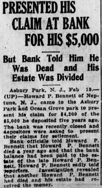 Asbury Park, N. Feb 19P. Bennett of NepN. J., came to the Asbury tune, Park and Ocean Grove park to present his claim for $4,200 of the $5,000 he deposited five years ago. The bank was recently closed and depositors were asked to present. their claims for setiement. Bank officials told Howard P. Bennett that Howard that Bennett ago and the bank died balance had paid to the estate the late Howard BenMett. Howard P. Bennett sadly told reporters. Investigation revealed Bennett that another Howard had died his estate had rethe money.