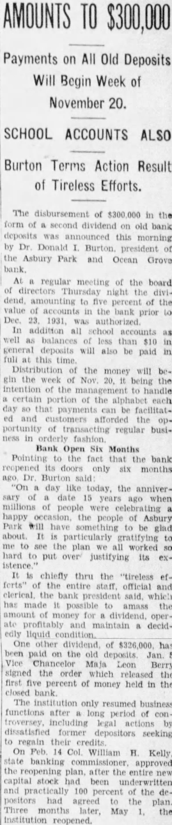 The disbursement of $300,000 in the form dividend bank old deposits announced this morning Dr. Donald president the Asbury Park and Ocean Grove bank. regular meeting the board percent the bank addition school accounts balances than $10 deposits also be paid the money will the being the intention the certain the be facilitatand portunity transacting regular busiin orderly Six Months Pointing fact bank six months Dr. Burton day today, the anniverpeople celebrating Asbury Park will glad gratifying the plan hard to put over justifying its chiefly thru the "tireless entire staff. official the bank president which has made possible amass the amount money dividend. profitably maintain decidliquid other dividend of $326,000. has on the old deposits. Chancelor Maja Leon Berry signed the order which released the first five percent of money held in the closed bank. The only resumed business functions after period of conincluding legal actions former depositors seeking regain On William H. banking approved the entire stock been 100 percent the dehad the plan. Three months later, May the reopened.