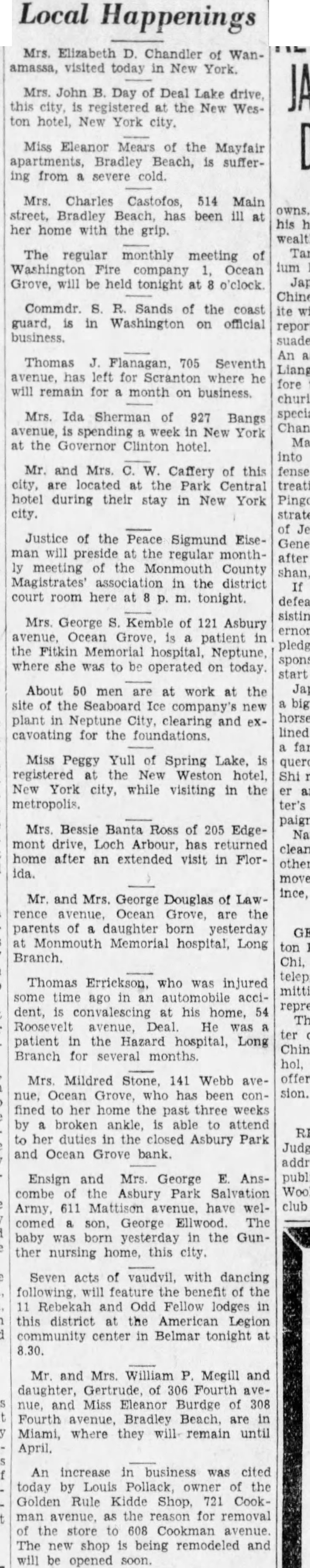 Mrs Mildred Stone, 141 Webb Ocean Grove, has been to her home the past three weeks broken ankle, able attend her duties the closed Asbury Park and Ocean Grove bank.