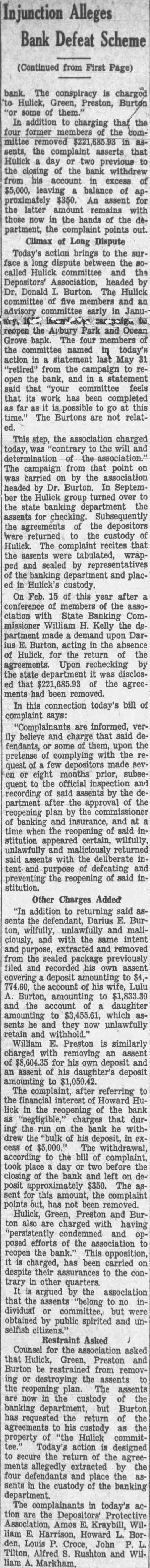 (Continued from First Page) bank. The conspiracy charged Hulick, Green, Preston, some addition to charging that the former the mittee removed in sents, the asserts that Hulick day two previous the closing the withdrew from $5,000, of $350. An the latter amount with those the of the partment, the complaint points Climax Long Dispute Today's action brings to the dispute between the Hulick committee Depositors' Association, headed Donald Burton. Hulick committee of five members and advisory committee early in reopen the Ambury Park and Grove bank. The four members named today's statement May "retired" from the campaign and "your committee that work has been completed possible this time." The Burtons are not relat- the association charged the will and the The campaign point carried by the by Dr. In Septemthe Hulick group turned banking the assents for checking. the the depositors returned the custody Hulick. The recites the wrapand sealed by banking placHulick's custody. On of this year after members the association State Banking Commissioner William H. Kelly the partment made upon DarBurton, acting the absence Hulick, for the return the agreements. Upon rechecking state department it was disclosthat the ments been In this connection today's bill complaint says: "Complainants are verbelieve charge that said fendants, some upon the pretense complying with the quest seveight months prior, subsequent official and recording by the partment after the approval of plan the and and when the said stitution certain, wilfully, assents the defeating preventing the reopening of stitution.