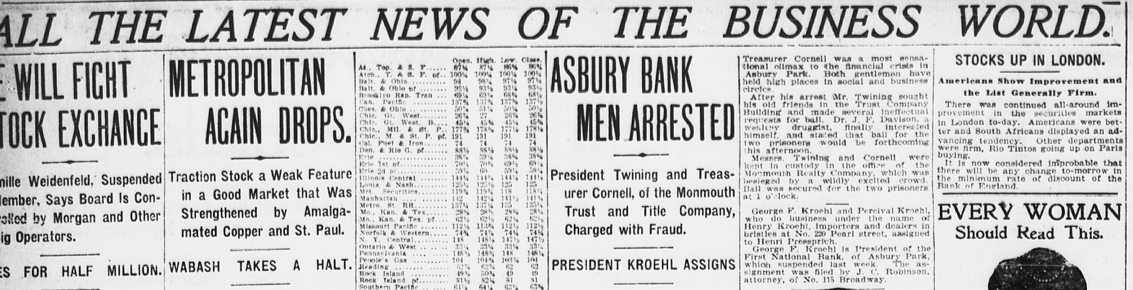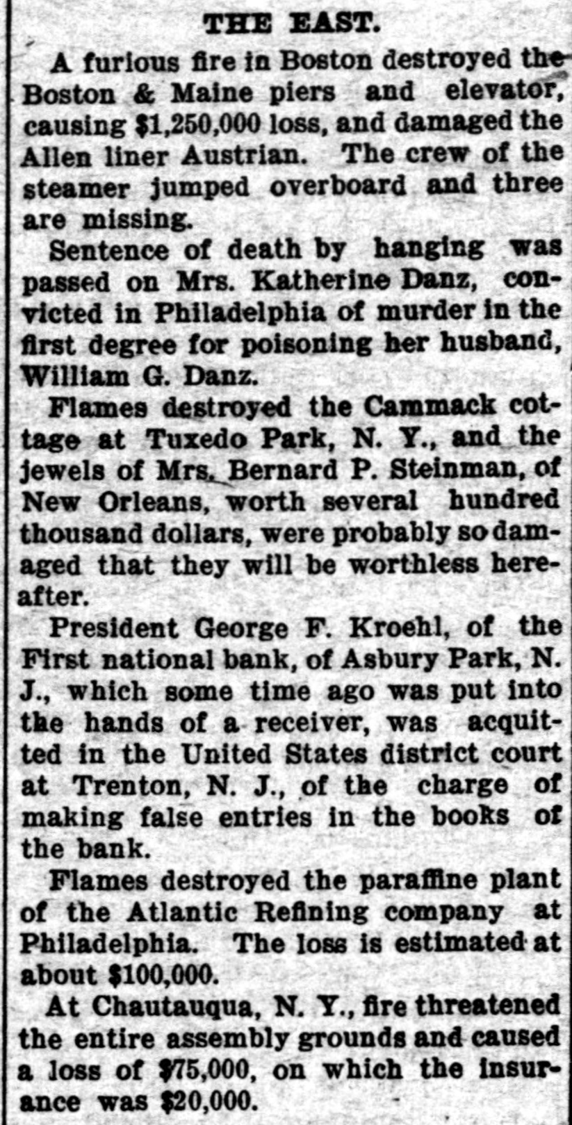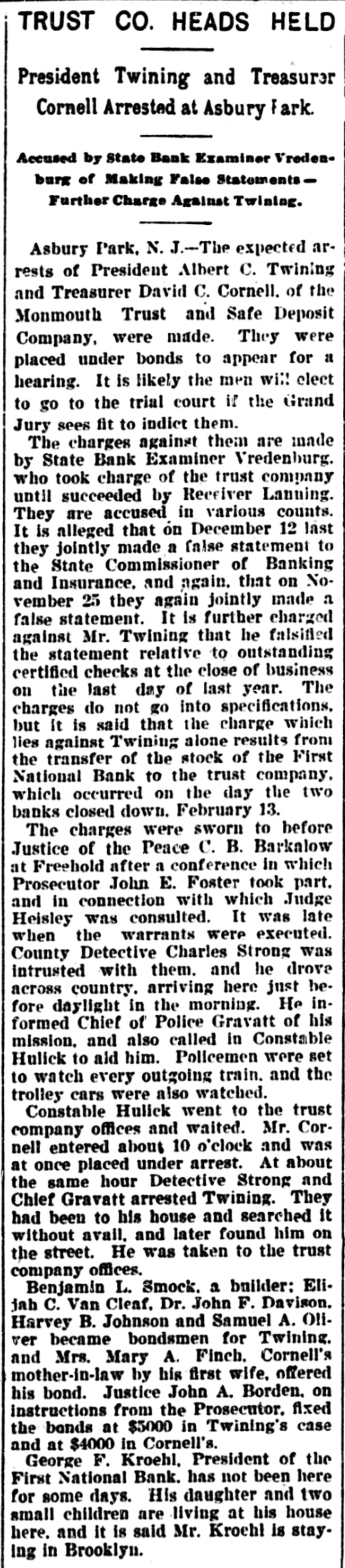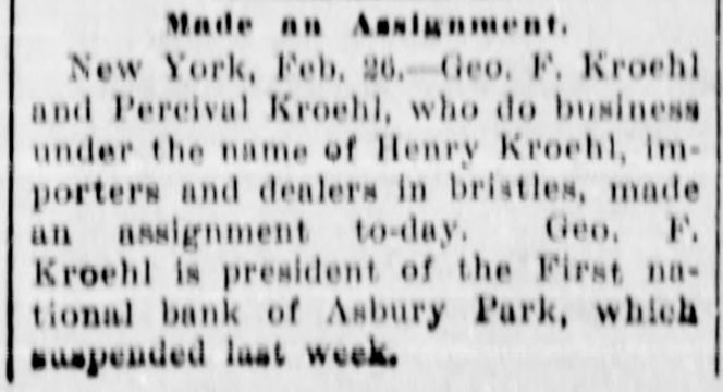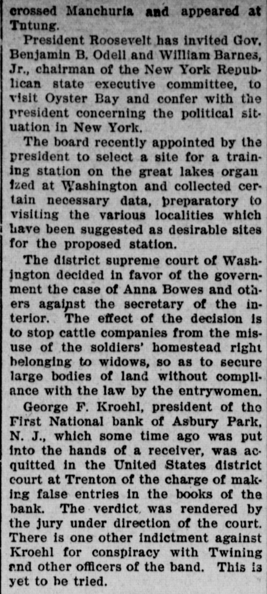 Geo. F. Kroehl, president of the First national bank of Asbury Park, N. J., which some time ago was put into the hands of a receiver, was, on the 7th, acquitted in the United States court of the charge of making false entries in the books of the bank. The verdict was found by the jury under direction of the court.