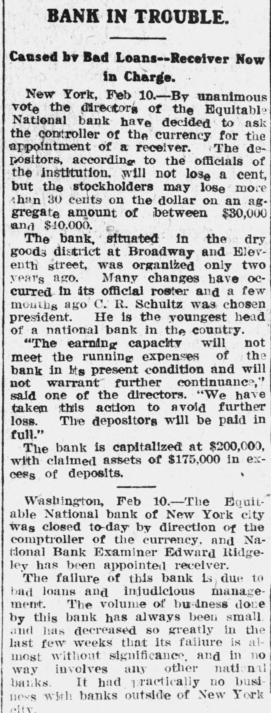 BANK IN TROUBLE. Caused bv Bad Loans--Receiver Now in Charge. New York, Feb 10.-By unanimous vote the directors of the Equitable National bank have decided to ask the controller of the currency for the appointment of a receiver. The depositors, according to the officials of the institution. will not lose a cent, but the stockholders may lose more than 30 cents on the dollar on an aggregate amount of between $30,000 and $40.000. The bank, situated in the dry goods district at Broadway and Eleventh street, was organized only two year's ago. Many changes have occurred in its official roster and a few months ago C. R. Schultz was chosen president. He is the youngest head of a national bank in the country. "The earning capacity will not meet the running expenses of the bank in its present condition and will not warrant further continuance," said one of the directors. "We have taken this action to avoid further loss. The depositors will be paid in full." The bank is capitalized at $200,000, with claimed assets of $175,000 in excess of deposits. Washington, Feb 10.-The Equitable National bank of New York city was closed to-day by direction of the comptroller of the currency, and National Bank Examiner Edward Ridgeley has been appointed receiver. The failure of this bank is due to bad loans and injudicious management. The volume of business done by this bank has always been small and has decreased so greatly in the last few weeks that its failure is almost without significance. and in no way involves any other national banks. It had practically no business with banks outside of New York city
