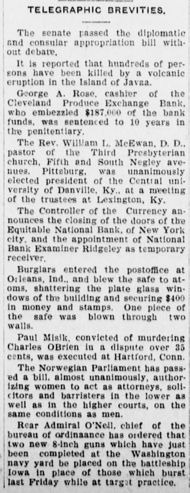 TELEGRAPHIC BREVITIES. The senate passed the diplomatic and consular appropriation bill without debate. It is reported that hundreds of persons have been killed by a volcanic eruption in the Island of Javaa. George A. Rose, cashier of the Cleveland Produce Exchange Bank, who embezzled $187,000 of the bank funds, was sentenced to 10 years in the penitentiary. The Rev. William L. McEwan, D. D., pastor of the Third Presbyterian church, Fifth and South Negley avenues, Pittsburg, was unanimously elected president of the Central university of Danville, Ky., at a meeting of the trustees at Lexington, Ky. The Controller of the Currency announces the closing of the doors of the Equitable National Bank, of New York city, and the appointment of National Bank Examiner Ridgeley as temporary receiver. Burglars entered the postoffice at Orleans, Ind., and blew the safe to atoms, shattering the plate glass windows of the building and securing $400 in money and stamps. One piece of the safe was blown through two walls. Paul Misik, convicted of murdering Charles OBrien in a dispute over 35 cents, was executed at Hartford, Conn. The Norwegian Parliament has passed a bill. almost unanimously, authorizing women to act as attorneys, solicitors and barristers in the lower as well as in the higher courts, on the same conditions as men. Rear Admiral O'Neil, chief of the bureau of ordinaance has ordered that two new 8-inch guns which have just been completed at the Washington navy yard be placed on the battleship Iowa in place of those which burst last Friday while at target practice.