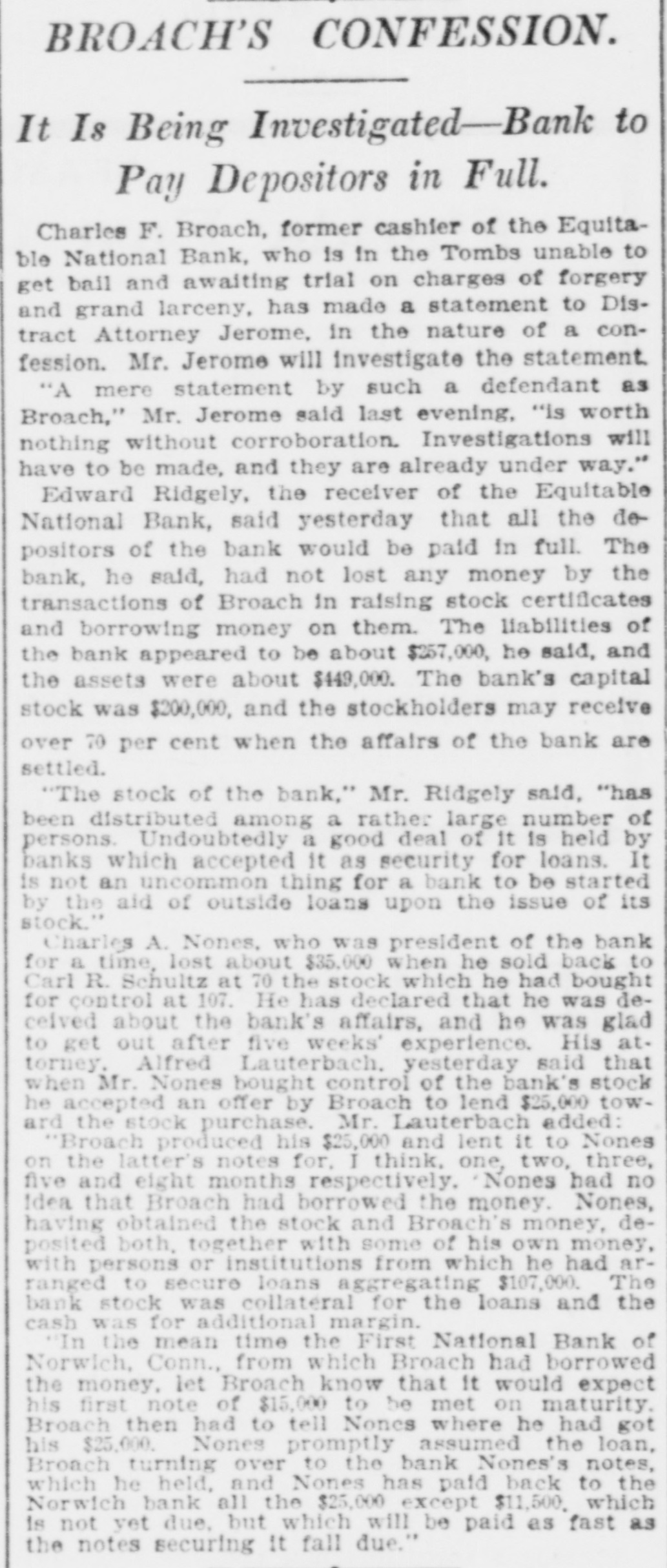 BROACH'S CONFESSION. It Is Being Investigated-Bank to Pay Depositors in Full. Charles F. Broach, former cashier of the Equitable National Bank, who is in the Tombs unable to get bail and awaiting trial on charges of forgery and grand larceny, has made a statement to Distract Attorney Jerome, in the nature of a confession. Mr. Jerome will investigate the statement "A mere statement by such a defendant as Broach," Mr. Jerome said last evening, "Is worth nothing without corroboration. Investigations will have to be made, and they are already under way." Edward Ridgely, the receiver of the Equitable National Bank, said yesterday that all the depositors of the bank would be paid in full. The bank, he said, had not lost any money by the transactions of Broach in raising stock certificates and borrowing money on them. The liabilities of the bank appeared to be about $257,000, he said, and the assets were about $449,000. The bank's capital stock was $200,000, and the stockholders may receive over 70 per cent when the affairs of the bank are settled. "The stock of the bank," Mr. Ridgely said, "has been distributed among a rather large number of persons. Undoubtedly a good deal of it is held by banks which accepted it as security for loans. It is not an uncommon thing for a bank to be started by the aid of outside loans upon the issue of its stock. Charles A. Nones, who was president of the bank for a time, lost about $35.000 when he sold back to Carl R. Schultz at 70 the stock which he had bought for control at 107. He has declared that he was decelved about the bank's affairs, and he was glad to get out after five weeks' experience. His attorney. Alfred Lauterbach, yesterday said that when Mr. Nones bought control of the bank's stock he accepted an offer by Broach to lend $25,000 toward the stock purchase. Mr. Lauterbach added: "Broach produced his $25,000 and lent it to Nones on the latter's notes for, I think, one, two, three, five and eight months respectively. Nones had no Idea that Broach had borrowed the money. Nones, having obtained the stock and Broach's money, deposited both. together with some of his own money, with persons or institutions from which he had arranged to secure loans aggregating $107,000. The bank stock was collateral for the loans and the cash was for additional margin. In the mean time the First National Bank of Norwich, Conn., from which Broach had borrowed the money. let Broach know that it would expect his first note of $15,000 to be met on maturity. Broach then had to tell Nones where he had got his $25,000. Nones promptly assumed the loan, Broach turning over to the bank Nones's notes, which he held, and Nones has paid back to the Norwich bank all the $25,000 except $11,500. which is not yet due. but which will be paid as fast as the notes securing it fall due."