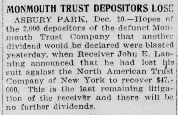 MONMOUTH TRUST DEPOSITORS LOSE ASBURY PARK, Dec. 10.-Hopes of the 2,000 depositors of the defunct Monmouth Trust Company that another dividend would be declared were blasted yesterday, when Receiver John E. Lanning announced that he had lost his suit against the North American Trust Company of New York to recover $47,000. This is the last remaining litigation of the receiver and there will be no further dividends.