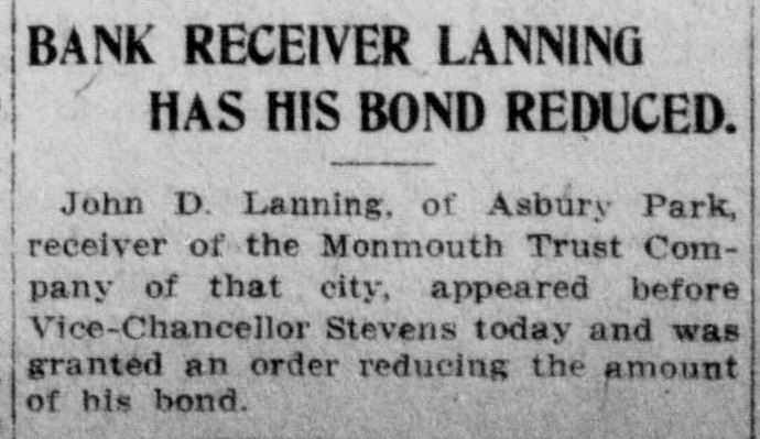 BANK RECEIVER LANNING HAS HIS BOND REDUCED. John D. Lanning, of Asbury Park, receiver of the Monmouth Trust Company of that city, appeared before Vice-Chancellor Stevens today and was granted an order reducing the amount of his bond.