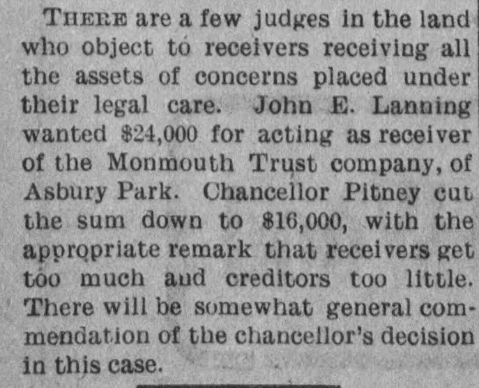 THERE are a few judges in the land who object to receivers receiving all the assets of concerns placed under their legal care. John E. Lanning wanted $24,000 for acting as receiver of the Monmouth Trust company, of Asbury Park. Chancellor Pitney cut the sum down to $16,000, with the appropriate remark that receivers get too much and creditors too little. There will be somewhat general commendation of the chancellor's decision in this case.