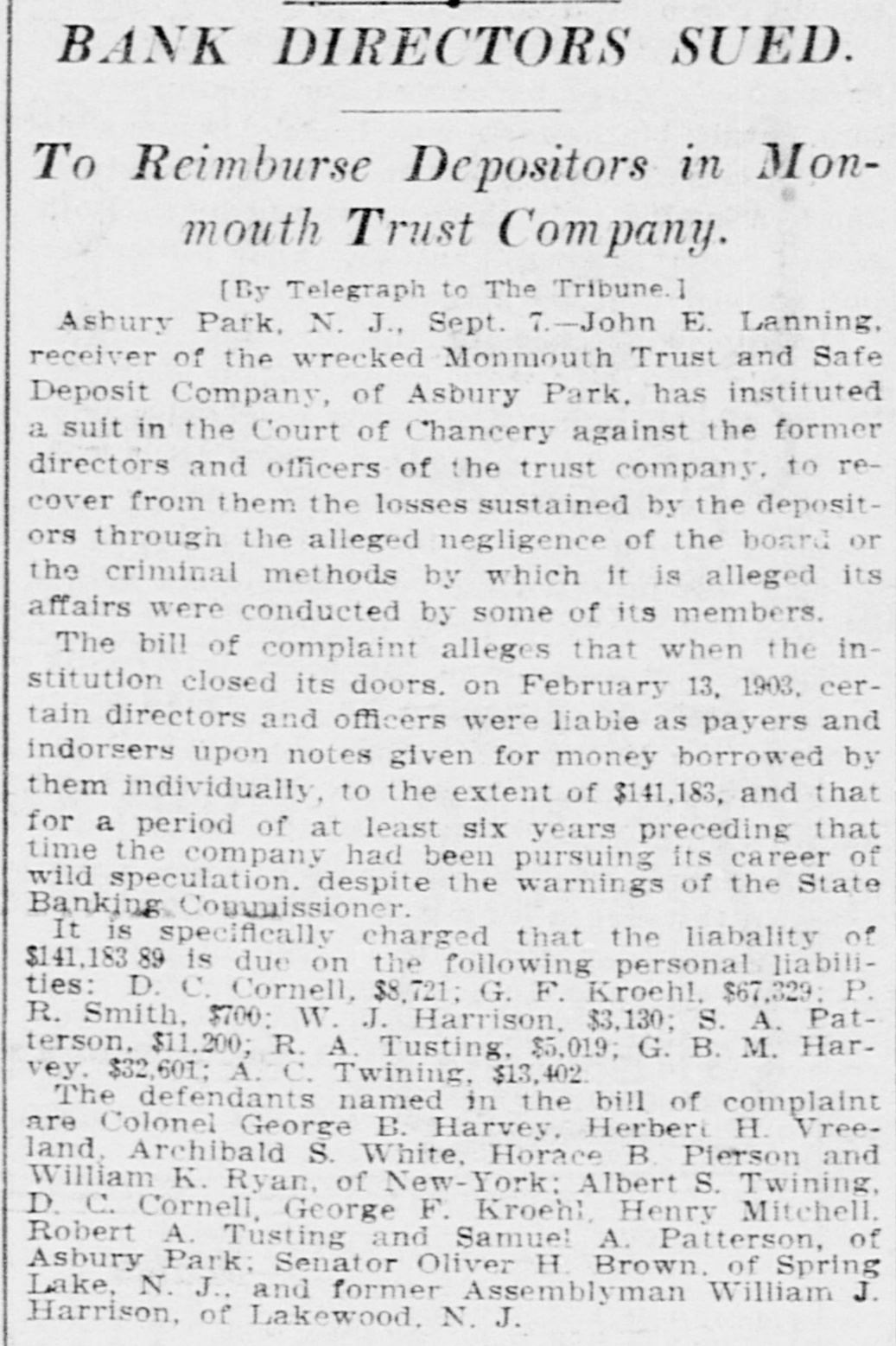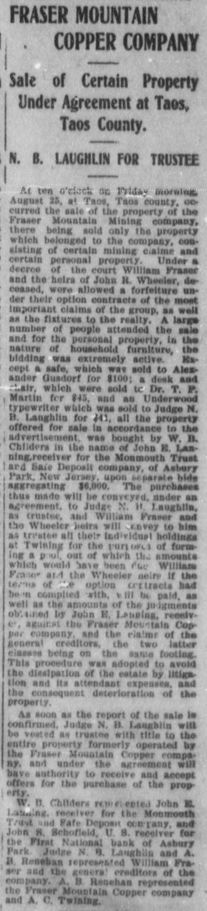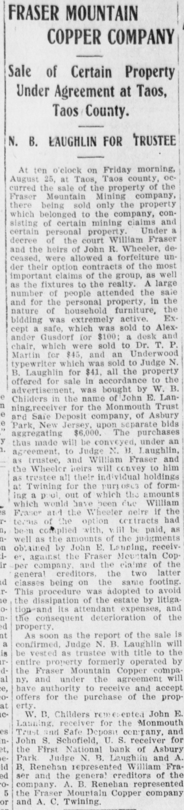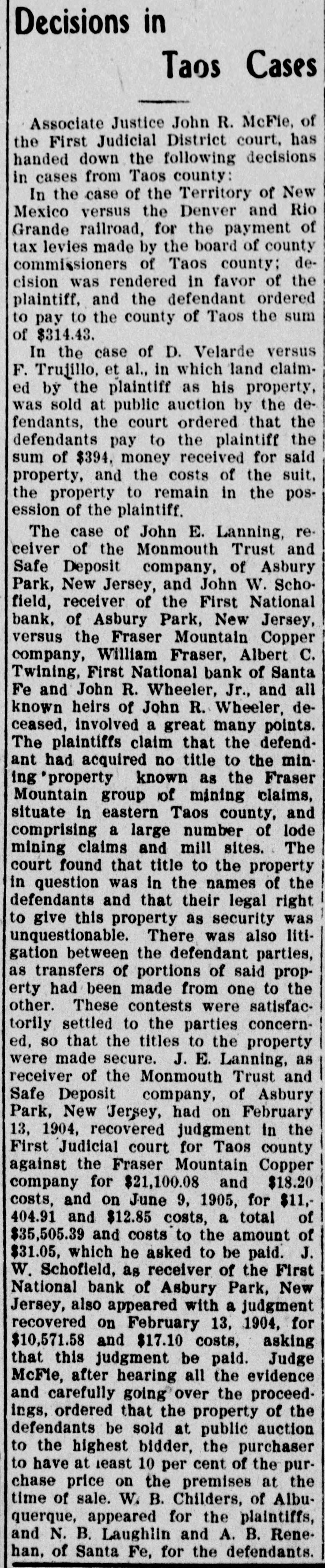 Decisions in Taos Cases Associate Justice John R. McFie, of the First Judicial District court, has handed down the following decisions in cases from Taos county: In the case of the Territory of New Mexico versus the Denver and Rio Grande railroad, for the payment of tax levies made by the board of county commissioners of Taos county; decision was rendered in favor of the plaintiff, and the defendant ordered to pay to the county of Taos the sum of $314.43. In the case of D. Velarde versus F. Trujillo, et al., in which land claimed by the plaintiff as his property, was sold at public auction by the defendants, the court ordered that the defendants pay to the plaintiff the sum of $394, money received for said property, and the costs of the suit, the property to remain in the posession of the plaintiff. The case of John E. Lanning, receiver of the Monmouth Trust and Safe Deposit company, of Asbury Park, New Jersey, and John W. Schofield, receiver of the First National bank, of Asbury Park, New Jersey, versus the Fraser Mountain Copper company, William Fraser, Albert C. Twining, First National bank of Santa Fe and John R. Wheeler, Jr., and all known heirs of John R. Wheeler, deceased, involved a great many points. The plaintiffs claim that the defendant had acquired no title to the mining "property known as the Fraser Mountain group of mining claims, situate in eastern Taos county, and comprising a large number of lode mining claims and mill sites. The court found that title to the property in question was in the names of the defendants and that their legal right to give this property as security was unquestionable. There was also litigation between the defendant parties, as transfers of portions of said property had been made from one to the other. These contests were satisfactorily settled to the parties concerned, so that the titles to the property were made secure. J. E. Lanning, as receiver of the Monmouth Trust and Safe Deposit company, of Asbury Park, New Jersey, had on February 13, 1904, recovered judgment in the First Judicial court for Taos county against the Fraser Mountain Copper company for $21,100.08 and $18.20 costs, and on June 9, 1905, for $11,404.91 and $12.85 costs, a total of $35,505.39 and costs to the amount of $31.05, which he asked to be paid. J. W. Schofield, as receiver of the First National bank of Asbury Park, New Jersey, also appeared with a judgment recovered on February 13, 1904, for $10,571.58 and $17.10 costs, asking that this judgment be paid. Judge McFie, after hearing all the evidence and carefully going over the proceedings, ordered that the property of the defendants be sold at public auction to the highest bidder, the purchaser to have at least 10 per cent of the purchase price on the premises at the time of sale. W. B. Childers, of Albuquerque, appeared for the plaintiffs, and N. B. Laughlin and A. B. Renehan, of Santa Fe, for the defendants.