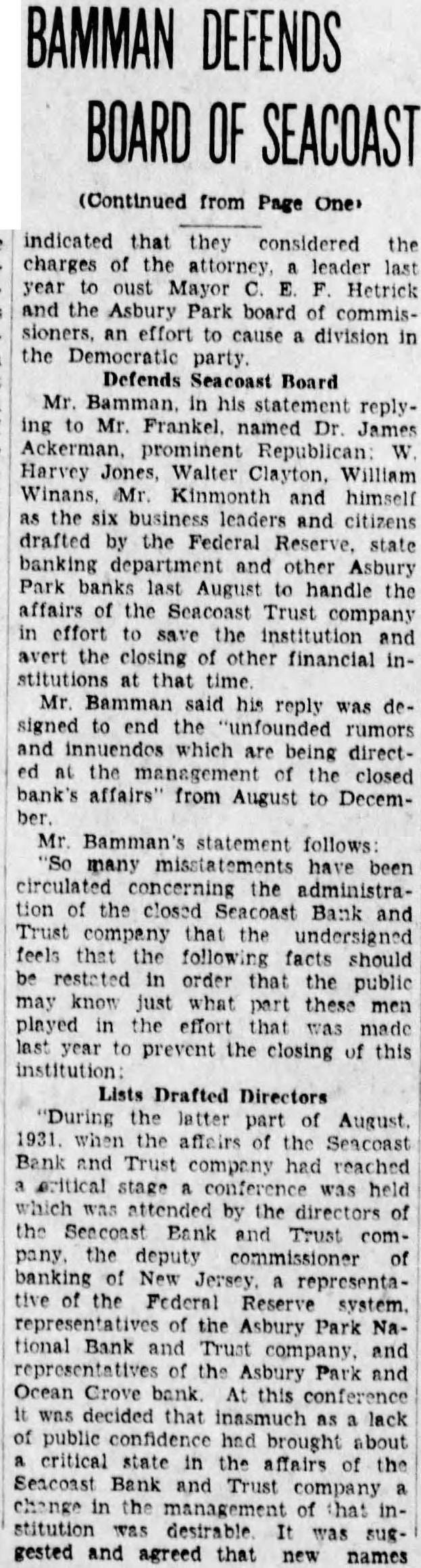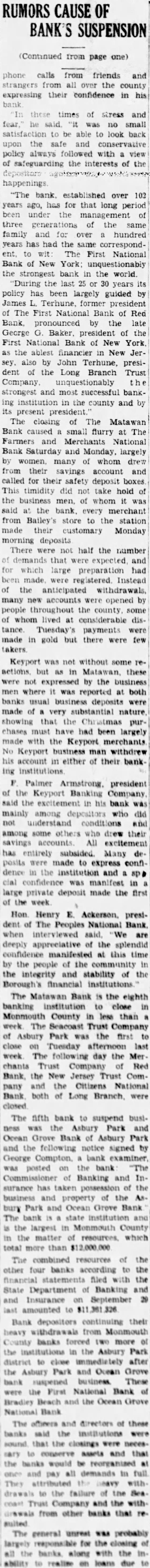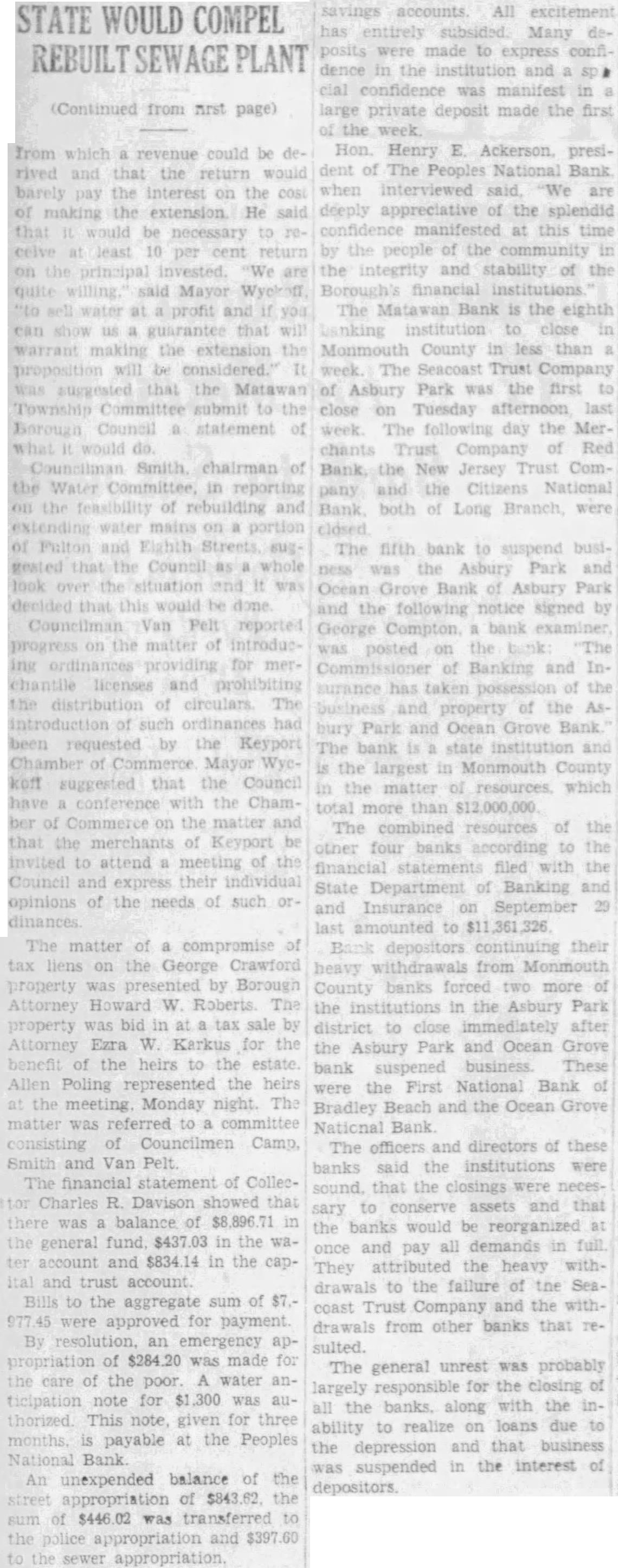STATE WOULD COMPEL PLANT (Continued from first page) Irom which a revenue could be derived and that the return would barely pay the interest on the cost of making the extension. He said that would be necessary to celve at least 10 per cent return on the principal invested. We are quite willing. said Mayor Wyckoff, "to water at a profit and if you can show us a guarantee that will warrant making the extension the proposition will be considered. It was suggested that the Matawan Township Committee submit to the Borough Council a statement of what would Councilman Smith chairman of the Water Committee, in reporting on the feasibility of rebuilding and extending water mains on a portion of Fulton and Eighth Streets sug. gested that the Council as whole look over the situation and It was decided that this would be done Councilman Van Pelt reported progress on the matter of introducing ordinances providing for merchantile licenses and prohibiting the distribution of circulars The introduction of such ordinances had been requested by the Keyport Chamber of Commerce Mayor Wye. koff suggested that the Council have a conference with the Cham ber of Commerce on the matter and that the merchants of Keyport be invited to attend a meeting of the Council and express their individual opinions of the needs of such ordinances The matter of a compromise of tax liens on the George Crawford property was presented by Borough Attorney Howard W. Roberts The property was bid in at tax sale by Attorney Ezra W. Karkus for the benefit of the heirs to the estate Allen Poling represented the heirs at the meeting Monday night. The matter was referred to a committee consisting of Councilmen Camp. Smith and Van Pelt The financial statement of Collector Charles R. Davison showed that there was a balance of $8,896.71 in the general fund. $437.03 in the water account and $834.14 in the capital and trust account Bills to the aggregate sum of $7.977 45 were approved for payment. By resolution, an emergency appropriation of $284.20 was made for the care of the poor A water anticipation note for $1,300 was authorized. This note, given for three months. is payable at the Peoples National Bank An unexpended balance of the street appropriation of $843.62 the sum of $446.02 was transferred to the police appropriation and $397.60 to the sewer appropriation. accounts All excitement has entirely subsided. Many deposits were made to express confidence in the institution and a cial confidence was manifest in large private deposit made the first the Hon, Henry E. Ackerson, president of The Peoples National Bank when interviewed said, "We are deeply appreciative of the splendid confidence manifested at this time by the people of the community in the integrity and stability of the Borough's financial institutions The Matawan Bank is the eighth Lanking institution to close Monmouth County in less than week. The Seacoast Trust Company of Asbury Park was the first to close on Tuesday afternoon last week. The following day the Merchants Trust Company of Red Bank the New Jersey Trust Company and the Citizens National Bank both of Long Branch, were closed The fifth bank to suspend business was the Asbury Park and Ocean Grove Bank of Asbury Park and the following notice signed by George Compton a bank examiner was posted on the The of Banking and Insurance has taken of the business and property of the Asbury Park and Ocean Grove Bank The bank is state institution and is the largest in Monmouth County in the matter of resources which total more than $12,000,000 The combined resources of the other four banks according to the financial statements filed with the State Department of Banking and and Insurance on September 29 last amounted to $11,361,326 Bank depositors continuing their heavy withdrawals from Monmouth County banks forced two more of the institutions in the Asbury Park district to close immediately after the Asbury Park and Ocean Grove bank suspened business These were the First National Bank of Bradley Beach and the Ocean Grove National Bank The officers and directors of these banks said the institutions were sound. that the closings were necessary to conserve assets and that the banks would be reorganized at once and pay all demands in full They attributed the heavy withdrawals to the failure of the Seacoast Trust Company and the withdrawals from other banks that resulted. The general unrest was probably largely responsible for the closing of all the banks. along with the inability to realize on loans due to the depression and that business was suspended in the interest of depositors