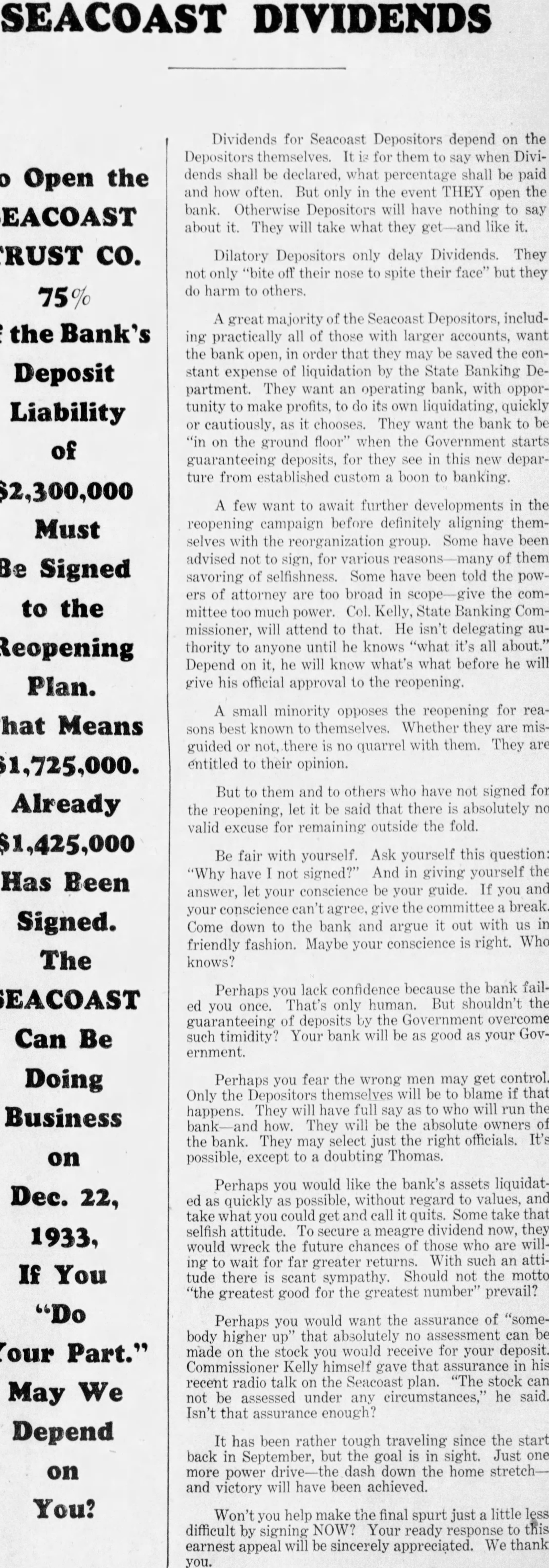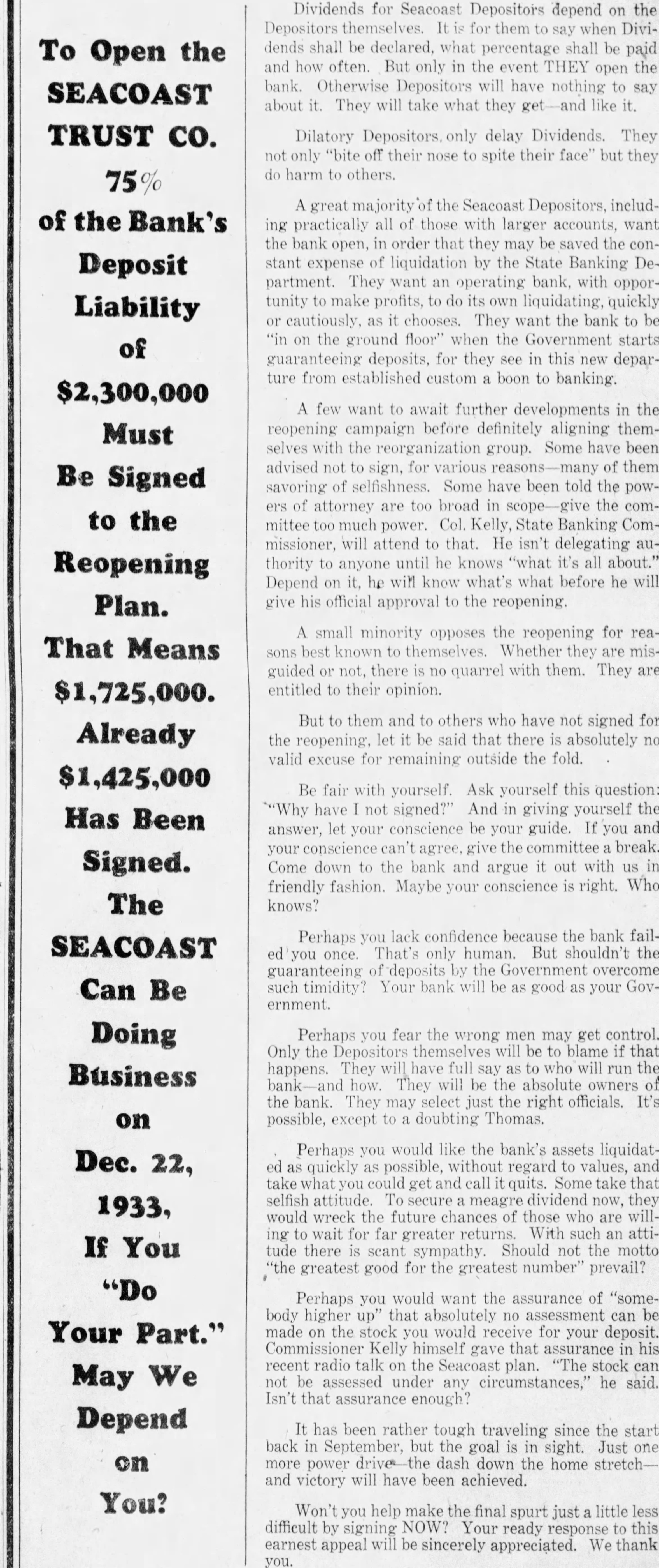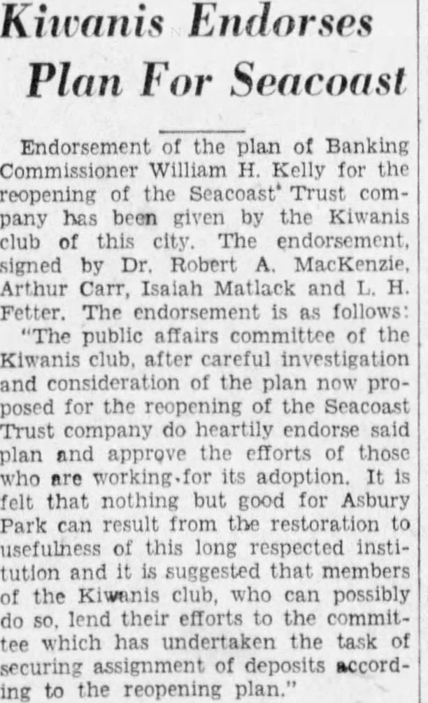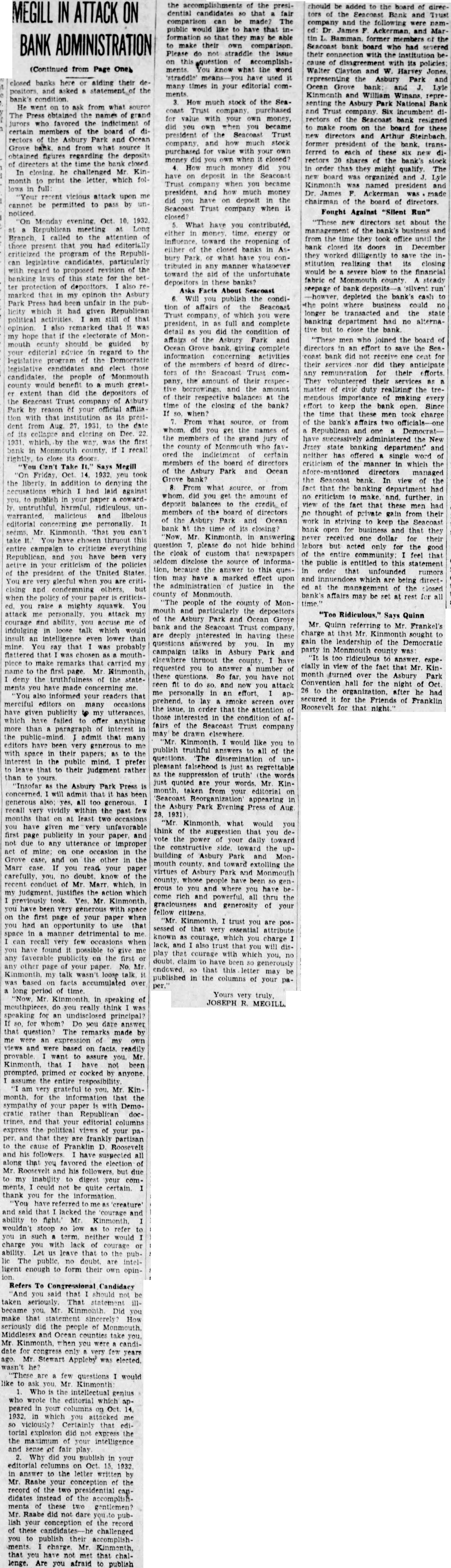 STATE WOULD COMPEL PLANT (Continued from first page) Irom which a revenue could be derived and that the return would barely pay the interest on the cost of making the extension. He said that would be necessary to celve at least 10 per cent return on the principal invested. We are quite willing. said Mayor Wyckoff, "to water at a profit and if you can show us a guarantee that will warrant making the extension the proposition will be considered. It was suggested that the Matawan Township Committee submit to the Borough Council a statement of what would Councilman Smith chairman of the Water Committee, in reporting on the feasibility of rebuilding and extending water mains on a portion of Fulton and Eighth Streets sug. gested that the Council as whole look over the situation and It was decided that this would be done Councilman Van Pelt reported progress on the matter of introducing ordinances providing for merchantile licenses and prohibiting the distribution of circulars The introduction of such ordinances had been requested by the Keyport Chamber of Commerce Mayor Wye. koff suggested that the Council have a conference with the Cham ber of Commerce on the matter and that the merchants of Keyport be invited to attend a meeting of the Council and express their individual opinions of the needs of such ordinances The matter of a compromise of tax liens on the George Crawford property was presented by Borough Attorney Howard W. Roberts The property was bid in at tax sale by Attorney Ezra W. Karkus for the benefit of the heirs to the estate Allen Poling represented the heirs at the meeting Monday night. The matter was referred to a committee consisting of Councilmen Camp. Smith and Van Pelt The financial statement of Collector Charles R. Davison showed that there was a balance of $8,896.71 in the general fund. $437.03 in the water account and $834.14 in the capital and trust account Bills to the aggregate sum of $7.977 45 were approved for payment. By resolution, an emergency appropriation of $284.20 was made for the care of the poor A water anticipation note for $1,300 was authorized. This note, given for three months. is payable at the Peoples National Bank An unexpended balance of the street appropriation of $843.62 the sum of $446.02 was transferred to the police appropriation and $397.60 to the sewer appropriation. accounts All excitement has entirely subsided. Many deposits were made to express confidence in the institution and a cial confidence was manifest in large private deposit made the first the Hon, Henry E. Ackerson, president of The Peoples National Bank when interviewed said, "We are deeply appreciative of the splendid confidence manifested at this time by the people of the community in the integrity and stability of the Borough's financial institutions The Matawan Bank is the eighth Lanking institution to close Monmouth County in less than week. The Seacoast Trust Company of Asbury Park was the first to close on Tuesday afternoon last week. The following day the Merchants Trust Company of Red Bank the New Jersey Trust Company and the Citizens National Bank both of Long Branch, were closed The fifth bank to suspend business was the Asbury Park and Ocean Grove Bank of Asbury Park and the following notice signed by George Compton a bank examiner was posted on the The of Banking and Insurance has taken of the business and property of the Asbury Park and Ocean Grove Bank The bank is state institution and is the largest in Monmouth County in the matter of resources which total more than $12,000,000 The combined resources of the other four banks according to the financial statements filed with the State Department of Banking and and Insurance on September 29 last amounted to $11,361,326 Bank depositors continuing their heavy withdrawals from Monmouth County banks forced two more of the institutions in the Asbury Park district to close immediately after the Asbury Park and Ocean Grove bank suspened business These were the First National Bank of Bradley Beach and the Ocean Grove National Bank The officers and directors of these banks said the institutions were sound. that the closings were necessary to conserve assets and that the banks would be reorganized at once and pay all demands in full They attributed the heavy withdrawals to the failure of the Seacoast Trust Company and the withdrawals from other banks that resulted. The general unrest was probably largely responsible for the closing of all the banks. along with the inability to realize on loans due to the depression and that business was suspended in the interest of depositors