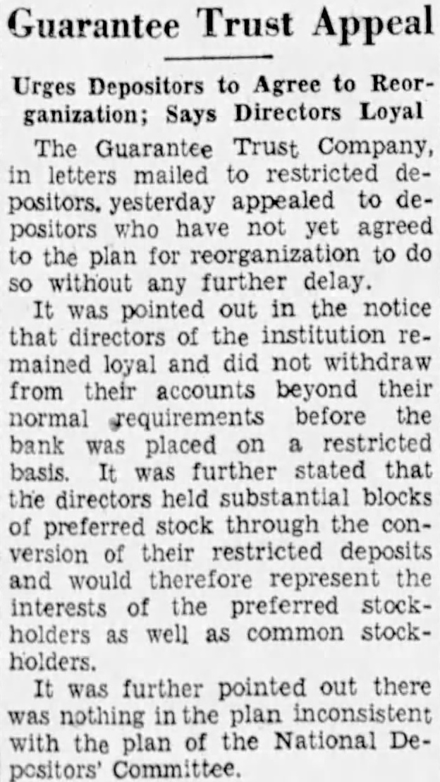 Guarantee Trust Appeal Urges Depositors Agree to Reorganization; Says Directors Loyal The Guarantee Trust Company, mailed restricted yesterday appealed positors agreed the plan reorganization without further delay. any was pointed out notice that directors the institution mained loyal and did withdraw from accounts beyond their normal requirements bank placed restricted further stated that the directors held substantial blocks of preferred through the version their deposits would represent interests the preferred stockholders well common holders. was further pointed out there plan the plan the National positors' Committee.