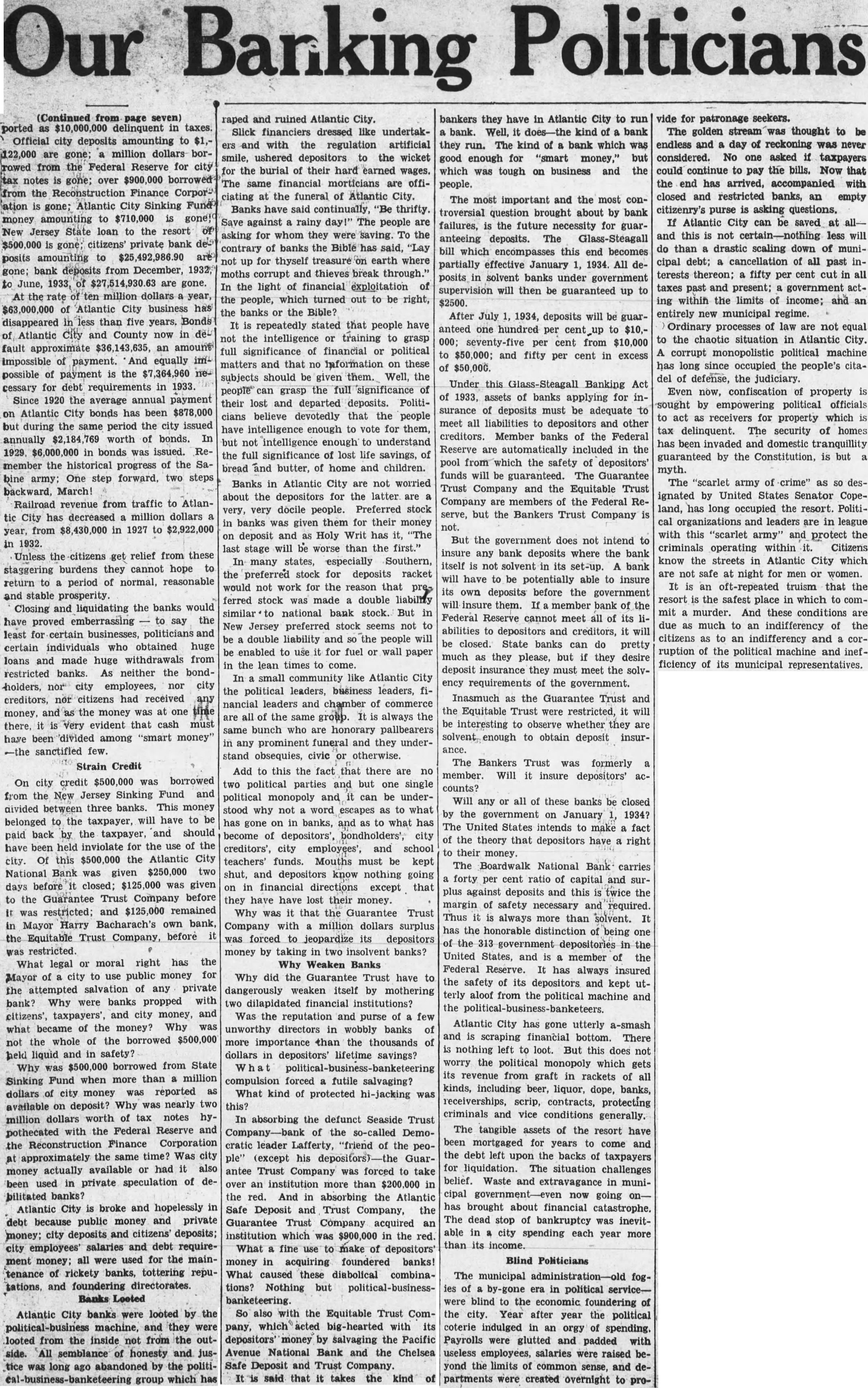 Our Barking Politicians (Continued from page seven) ported as $10,000,000 delinquent in taxes. Official city deposits amounting to $1,122,000 are gone; a million dollars borrowed from the Federal Reserve for city tax notes is gone; over $900,000 borrowed from the Reconstruction Finance Corpor2 ation is gone; Atlantic City Sinking Fund money amounting to $710,000 is gone," New Jersey State loan to the resort of $500,000 is gone; citizens' private bank de-9 posits amounting to $25,492,986.90 are gone; bank deposits from December, 1932, to June, 1933, of $27,514,930.63 are gone. At the rate of ten million dollars a year, $63,000,000 of Atlantic City business has disappeared in less than five years. Bonds of Atlantic City and County now in default approximate $36,143,635, an amount impossible of payment. And equally impossible of payment is the $7,364,960 necessary for debt requirements in 1933. Since 1920 the average annual payment on Atlantic City bonds has been $878,000 but during the same period the city issued annually $2,184,769 worth of bonds. In 1929, $6,000,000 in bonds was issued. Remember the historical progress of the Sabine army; One step forward, two steps backward, March! Railroad revenue from traffic to Atlantic City has decreased a million dollars a year, from $8,430,000 in 1927 to $2,922,000 in 1932. Unless the citizens get relief from these staggering burdens they cannot hope to return to a period of normal, reasonable and stable prosperity. Closing and liquidating the banks would have proved emberrassing to say the least for certain businesses, politicians and certain individuals who obtained huge loans and made huge withdrawals from restricted banks. As neither the bondholders, nor city employees, nor city creditors, nor citizens had received any money, and as the money was at one time there, it is very evident that cash must have been divided among "smart money" -the sanctified few. Strain Credit On city credit $500,000 was borrowed from the New Jersey Sinking Fund and divided between three banks. This money belonged to the taxpayer, will have to be paid back by the taxpayer, and should have been held inviolate for the use of the city. Of this $500,000 the Atlantic City National Bank was given $250,000 two days before it closed; $125,000 was given to the Guarantee Trust Company before It was restricted; and $125,000 remained in Mayor Harry Bacharach's own bank, the Equitable Trust Company, before it was restricted. What legal or moral right has the Mayor of a city to use public money for the attempted salvation of any private bank? Why were banks propped with citizens', taxpayers', and city money, and what became of the money? Why was not the whole of the borrowed $500,000 held liquid and in safety? Why was $500,000 borrowed from State Sinking Fund when more than a million dollars of city money was reported as available on deposit? Why was nearly two million dollars worth of tax notes hypothecated with the Federal Reserve and the Reconstruction Finance Corporation at approximately the same time? Was city money actually available or had it also been used in private speculation of debilitated banks? Atlantic City is broke and hopelessly in debt because public money and private money; city deposits and citizens' deposits; city employees' salaries and debt requirement money; all were used for the maintenance of rickety banks, tottering reputations, and foundering directorates. Banks Looted Atlantic City banks were looted by the political-business machine, and they were looted from the inside not from the outside. All semblance of honesty and justice was long ago abandoned by the political-business-banketeering group which has raped and ruined Atlantic City. Slick financiers dressed like undertakers and with the regulation artificial smile, ushered depositors to the wicket for the burial of their hard earned wages. The same financial morticians are officiating at the funeral of Atlantic City. Banks have said continually, "Be thrifty. Save against a rainy day!" The people are asking for whom they were saving. To the contrary of banks the Bible has said, "Lay not up for thyself treasure on earth where moths corrupt and thieves break through." In the light of financial exploitation of the people, which turned out to be right, the banks or the Bible? It is repeatedly stated that people have not the intelligence or training to grasp full significance of financial or political matters and that no Information on these subjects should be given them. Well, the people can grasp the full significance of their lost and departed deposits. Politicians believe devotedly that the people have intelligence enough to vote for them, but not intelligence enough to understand the full significance of lost life savings, of bread and butter, of home and children. Banks in Atlantic City are not worried about the depositors for the latter are a very, very docile people. Preferred stock in banks was given them for their money on deposit and as Holy Writ has it, "The last stage will be worse than the first." In many states, especially Southern, the preferred stock for deposits racket would not work for the reason that preferred stock was made a double liability similar to national bank stock. But in New Jersey preferred stock seems not to be a double liability and SO the people will be enabled to use it for fuel or wall paper in the lean times to come. In a small community like Atlantic City the political leaders, business leaders, financial leaders and chamber of commerce are all of the same group. It is always the same bunch who are honorary pallbearers in any prominent funeral and they understand obsequies, civic or otherwise. Add to this the fact that there are no two political parties and but one single political monopoly and it can be understood why not a word escapes as to what has gone on in banks, and as to what has become of depositors', bondholders', city creditors', city employees', and sch