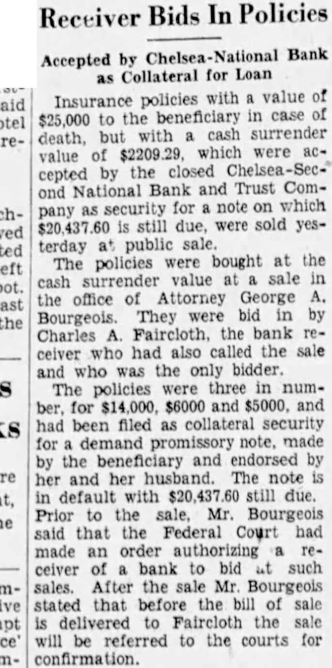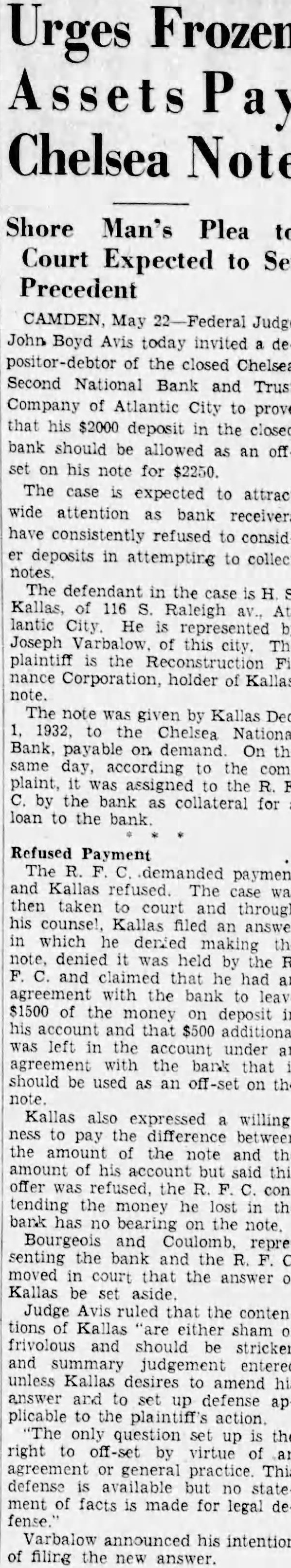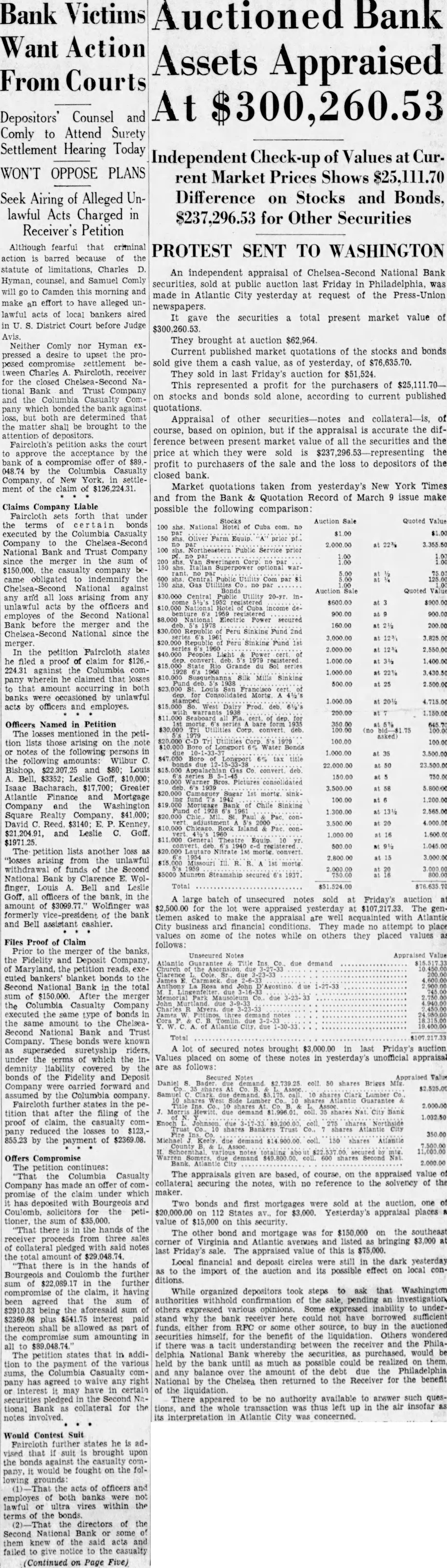 Offers Compromise continues: The appraisals given are based, the appraised value of "That the Columbia Casualty collateral securing the with no reference to the solvency of the made notes, Company under which maker. has and Two bonds and first mortgages were sold the auction, one for peti- 112 States for Yesterday's appraisal places tioner, $35,000. value of $15,000 this on security. "That the hands of the The other bond and mortgage for $150,000 the southeast receiver from three $3,000 corner Virginia and Atlantic avenues and listed bringing collateral pledged notes Friday's sale. The appraised value this $75,000. the Local financial and deposit circles were still the dark yesterday "That there the hands of to the import of the auction its possible effect on local Bourgeois the further ditions. the further While organized depositors took steps to that Washington compromise claim, having withhold the investigation, Some inability to underbeing the others opinions. stand the could not have sufficient plus interest either buy the auctioned thereon shall funds, RFC some for the benefit of the Others wondered the compromise amounting the and the Philathere in addi- Bank securities, purchased, would be The petition states that delphia whereby the the various the bank until much possible realized the payment by the the amount the debt the sums, any then returned the Receiver for the benefit pany has agreed waive any right the Chelsea interest may have certain the liquidation. the to be authority available to answer such quesThere no tional Bank collateral for tions, and was thus left the air insofar notes involved. its interpretation in Atlantic City