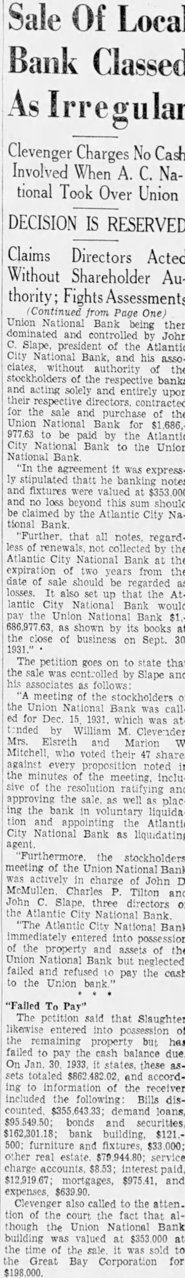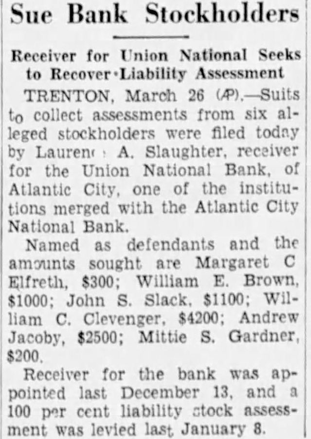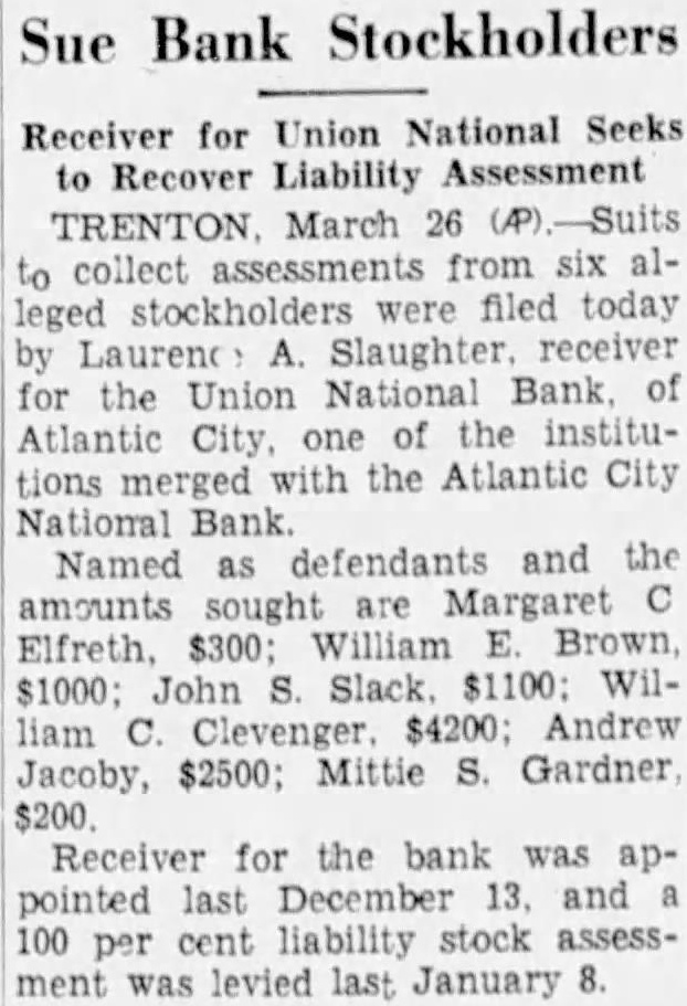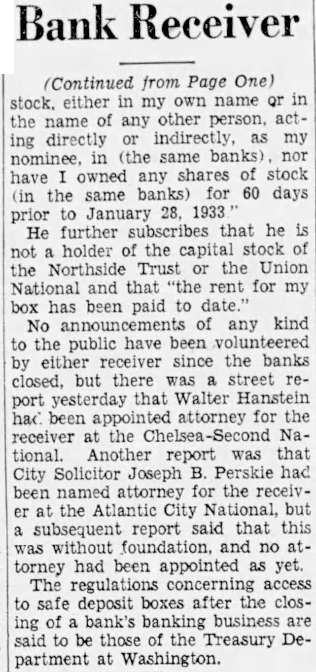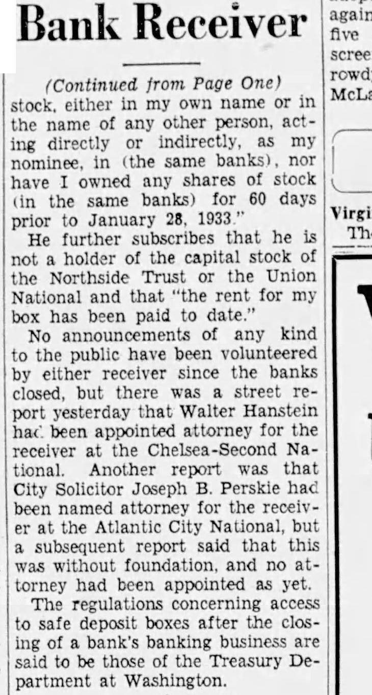 Receiver rowdy (Continued from Page One) stock. either own name or of any other person, actthe name ing directly or indirectly, as my nominee, (the same banks), nor have owned shares of stock the same banks) 60 days (in January 28. The He further subscribes that he holder the capital stock of the Northside Trust the Union National and that rent for my box has been paid to date." No any kind the public have been by either since the banks closed, but there street yesterday that Walter Hanstein had attorney for the receiver at the National Another report was that City Solicitor Joseph Perskie had been named the the Atlantic City but report that was without foundation, no attorney had been appointed as yet. The regulations concerning access to safe deposit boxes after closof bank's business are to be those the Treasury Department at Washington.