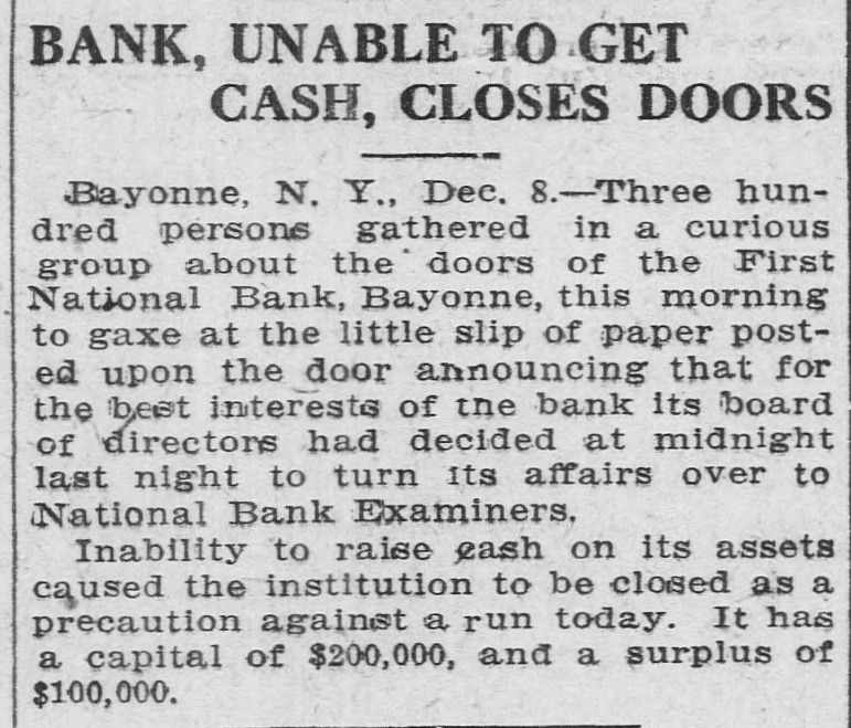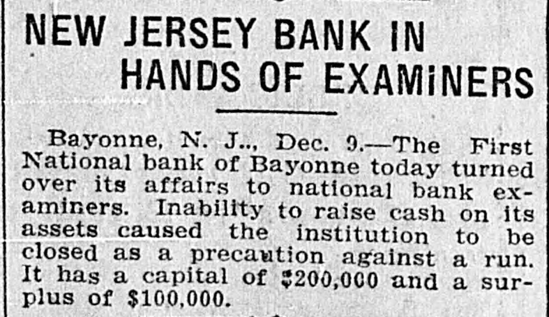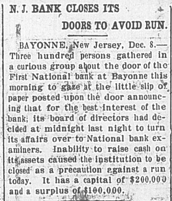 N.J. BANK CLOSES ITS DOORS TO AVOID RUN. BAYONNE, New Jersey, Dec. 8.— Three hundred persons gathered in a curious group about the door of the First National bank at Bayonne this morning to gaze at the little slip of paper posted upon the door announcing that for the best interest of the bank; its board of directors had decided at midnight last night to turn its affairs over to National bank examiners. Inability to raise cash on its assets caused the institution to be closed as a precaution egainst a run today. It has a capital of $200,000 and a surplus of $100,000.