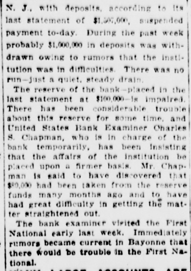 N. J., with deposits, according to Its last statement of $1,507,000, suspended payment to-day. During the past week probably $1,000,000 in deposits was withdrawn owing to rumors that the institution was in difficulties. There was no run-just a quiet. steady drain. The reserve of the bank-placed in the last statement at $100,000-18 impaired. There has been considerable trouble about this reserve for some time. and United States Bank Examiner Charles S. Chapman, who is In charge of the bank temporarily, has been Insisting that the affairs of the institution be placed upon a firmer basis. Mr. Chapman is said to have discovered that $80,000 had been taken from the reserve funds many months ago and to have had great difficulty in getting the matter straightened out. The bank examiner visited the First National early last week. Immediately rumors became current in Bayonne that there would be trouble in the First National. .- APE