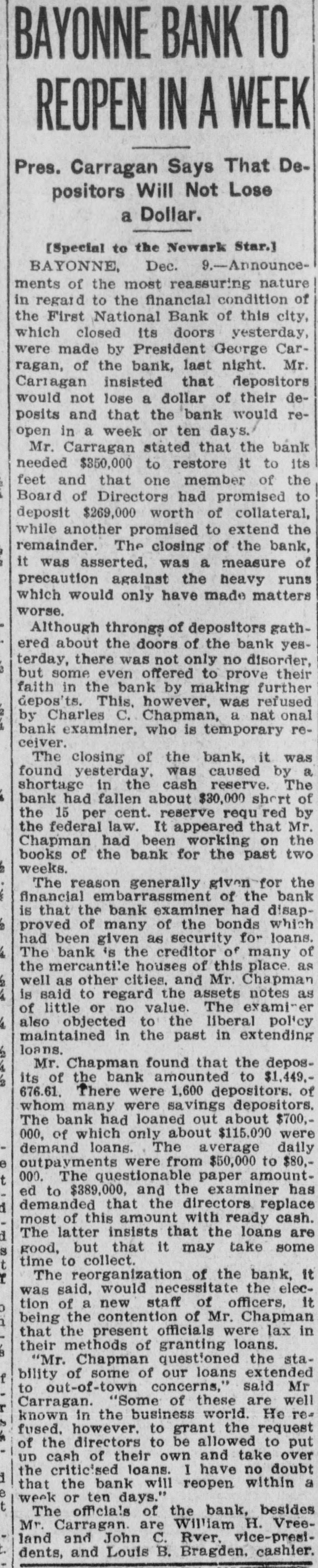 BAYONNE BANK TO REOPEN IN A WEEK Pres. Carragan Says That Depositors Will Not Lose a Dollar. [Special to the Newark Star.] BAYONNE, Dec. 9.-Announcements of the most reassuring nature in regard to the financial condition of the First National Bank of this city, which closed its doors yesterday, were made by President George Carragan, of the bank, last night. Mr. Cariagan insisted that depositors would not lose a dollar of their deposits and that the bank would reopen in a week or ten days. Mr. Carragan stated that the bank needed $350,000 to restore it to its feet and that one member of the Board of Directors had promised to deposit $269,000 worth of collateral, while another promised to extend the remainder. The closing of the bank, it was asserted, was a measure of precaution against the heavy runs which would only have made matters worse. Although throngs of depositors gathered about the doors of the bank yesterday, there was not only no disorder, but some even offered to prove their faith in the bank by making further depos'ts. This, however, was refused by Charles C. Chapman, a nat onal bank examiner, who is temporary receiver. The closing of the bank, it was found yesterday. was caused by a shortage in the cash reserve. The bank had fallen about $30,000 short of the 15 per cent. reserve requ red by the federal law. It appeared that Mr. Chapman had been working on the books of the bank for the past two weeks. The reason generally given for the financial embarrassment of the bank is that the bank examiner had disapproved of many of the bonds which had been given as security for loans. The bank is the creditor of many of the mercantile houses of this place. as well as other cities. and Mr. Chapman is said to regard the assets notes as of little or no value. The examiner also objected to the liberal policy maintained in the past in extending loans. Mr. Chapman found that the deposits of the bank amounted to $1,449.676.61. There were 1,600 depositors. of whom many were savings depositors. The bank had loaned out about $700,000, of which only about $115,000 were demand loans. The average daily e outpayments were from $50,000 to $80,000. The questionable paper amounted to $389,000, and the examiner has demanded that the directors replace d most of this amount with ready cash. The latter insists that the loans are 1 good, but that it may take some S time to collect. The reorganization of the bank, It was said, would necessitate the election of a new staff of officers, it being the contention of Mr. Chapman that the present officials were lax in their methods of granting loans. "Mr. Chapman questioned the stability of some of our loans extended to out-of-town concerns," said Mr Carragan. "Some of these are well known in the business world. He refused. however. to grant the request of the directors to be allowed to put up cash of their own and take over the criticised loans. I have no doubt that the bank will reopen within a week or ten days." The officials of the bank, besides Mr. Carragan. are William H. Vreeland and John C. Rver. vice-presidents, and Louis B. Bragden. cashier.