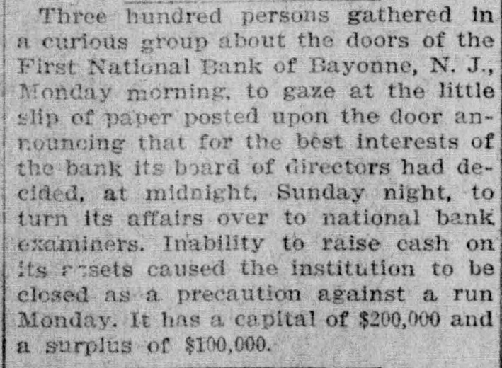 Three hundred persons gathered in a curious group about the doors of the First National Bank of Bayonne, N. J., Monday morning, to gaze at the little slip of paper posted upon the door announcing that for the best interests of the bank its board of directors had decided, at midnight, Sunday night, to turn its affairs over to national bank examiners. Inability to raise cash on its posets caused the institution to be closed as a precaution against a run Monday. It has a capital of $200,000 and a surplus of $100,000.