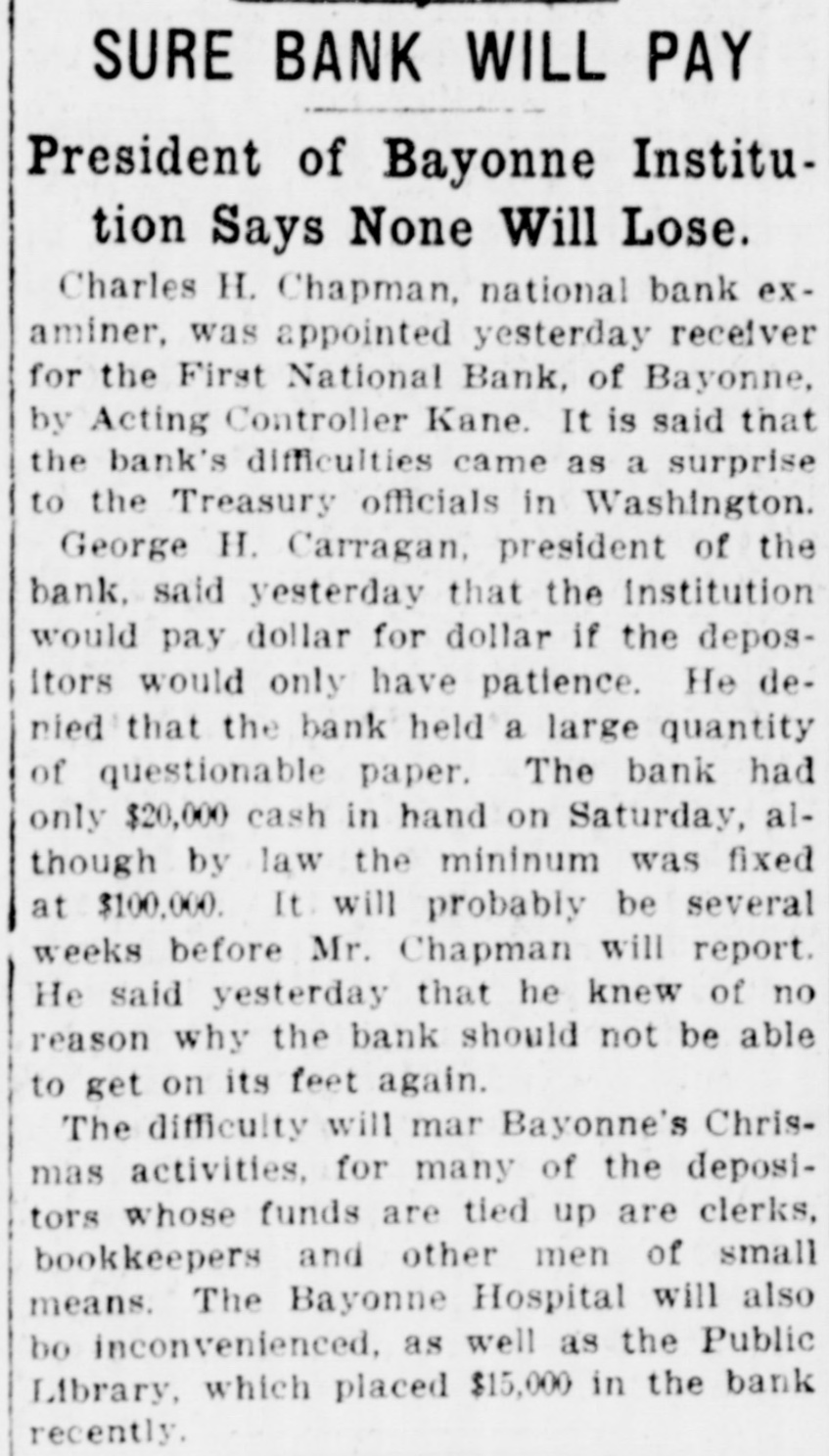 SURE BANK WILL PAY President of Bayonne Institution Says None Will Lose. Charles H. Chapman, national bank examiner, was appointed yesterday receiver for the First National Bank, of Bayonne, by Acting Controller Kane. It is said that the bank's difficulties came as a surprise to the Treasury officials in Washington. George H. Carragan, president of the bank, said yesterday that the Institution would pay dollar for dollar if the depositors would only have patience. He denied that the bank held a large quantity of questionable paper. The bank had only $20,000 cash in hand on Saturday, although by law the mininum was fixed at $100,000. It will probably be several weeks before Mr. Chapman will report. He said yesterday that he knew of no reason why the bank should not be able to get on its feet again. The difficulty will mar Bayonne's Chrismas activities, for many of the depositors whose funds are tied up are clerks, bookkeepers and other men of small means. The Bayonne Hospital will also bo inconvenienced, as well as the Public Library, which placed $15,000 in the bank recently.